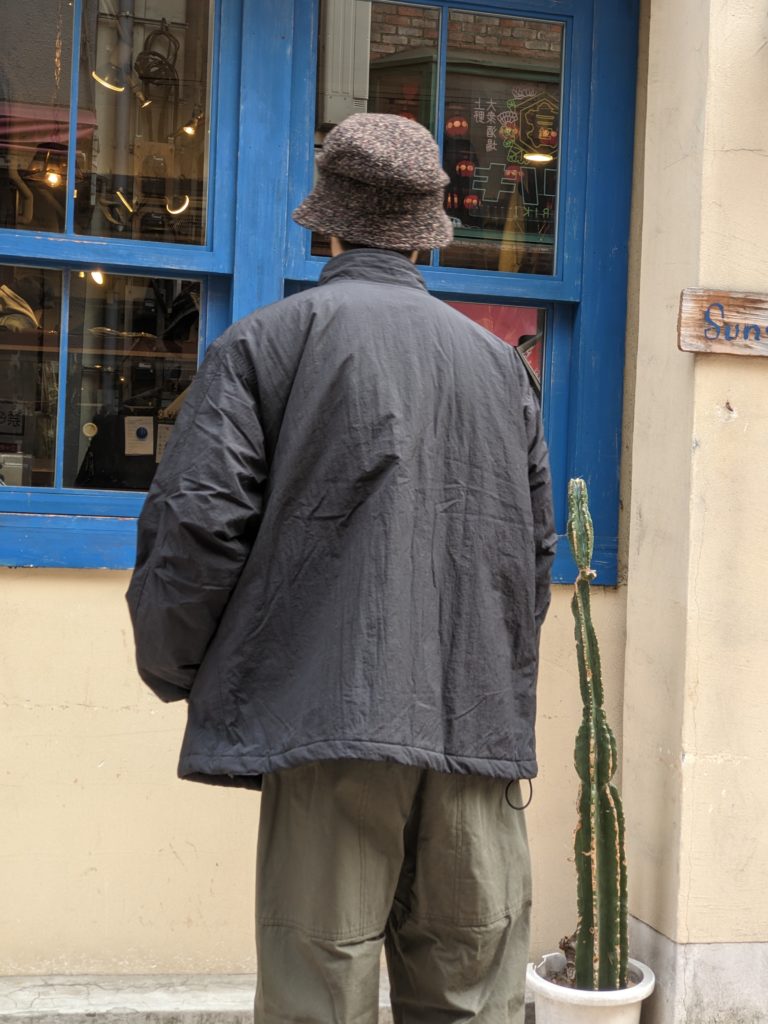 スタンドカラーに、ゆとりのあるワイドシルエットがベースの中綿ジャケット。