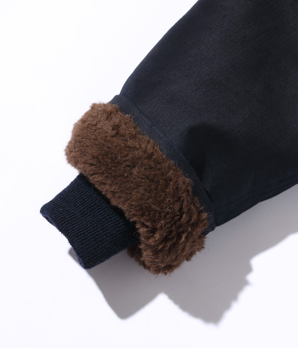 表素材には他のデッキジャケット同様に通常“ジャングルクロス”と呼ばれるコットングログランが使用され、裏地には遮風性と保温性に優れたアルパカモヘア・ウールパイルを使用している。