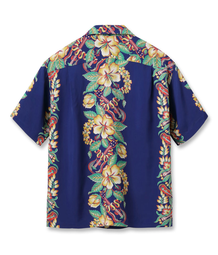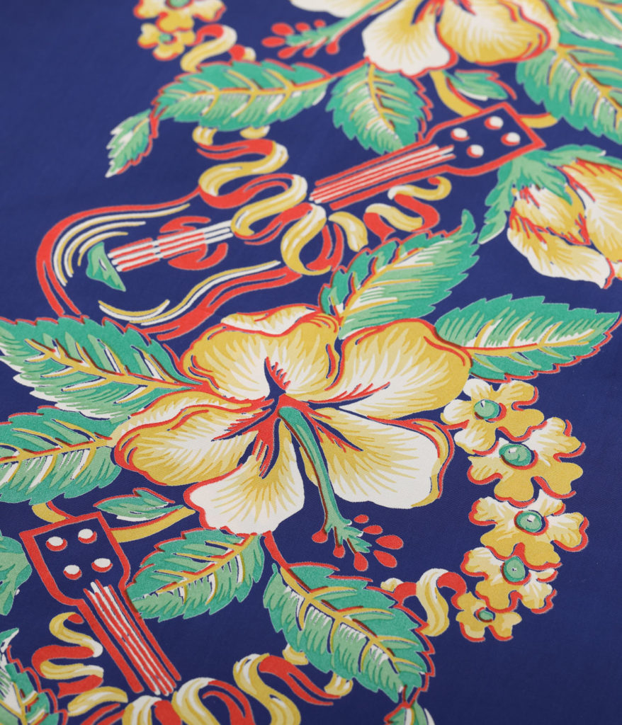 ハワイの象徴ともいえるレイ、ウクレレ、ハイビスカスをメインモチーフに、ボーダー・パターンを構成した人気のデザイン。