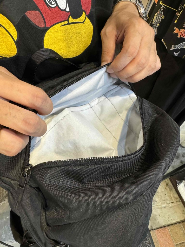 ジッパー付きフロントポケットはキークリップ付き。内側には、出し入れしやすいスタッシュポケットやジッパー付きセキュリティポケットなど収納も充実。