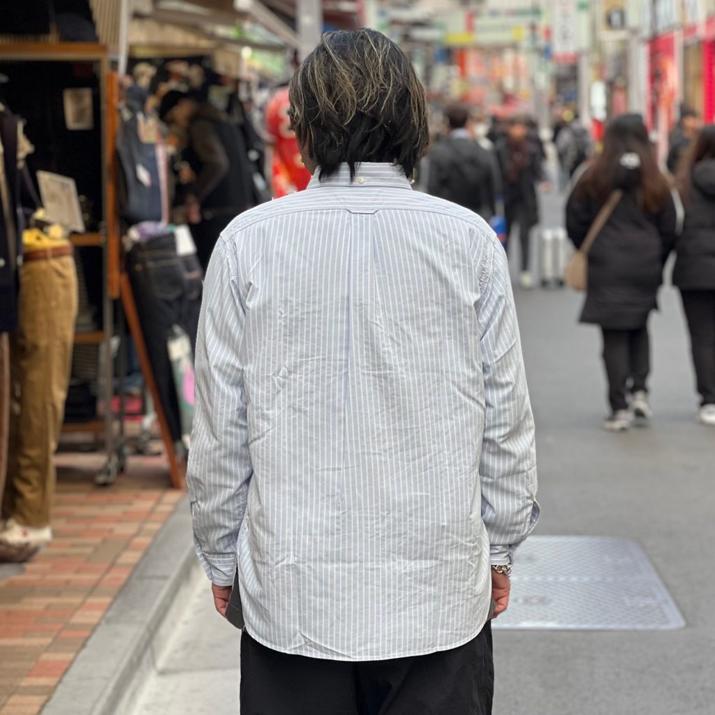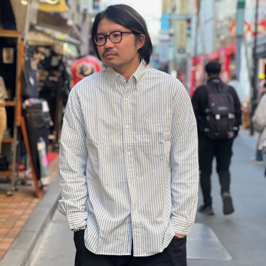 フロントの5つボタンや裾のラウンドが特徴的なヴィンテージシャツをデザインベースにしたリラックスフィットのボタンダウンストライプシャツです。