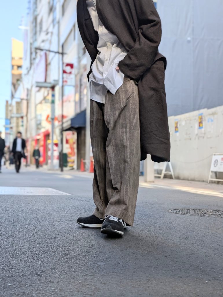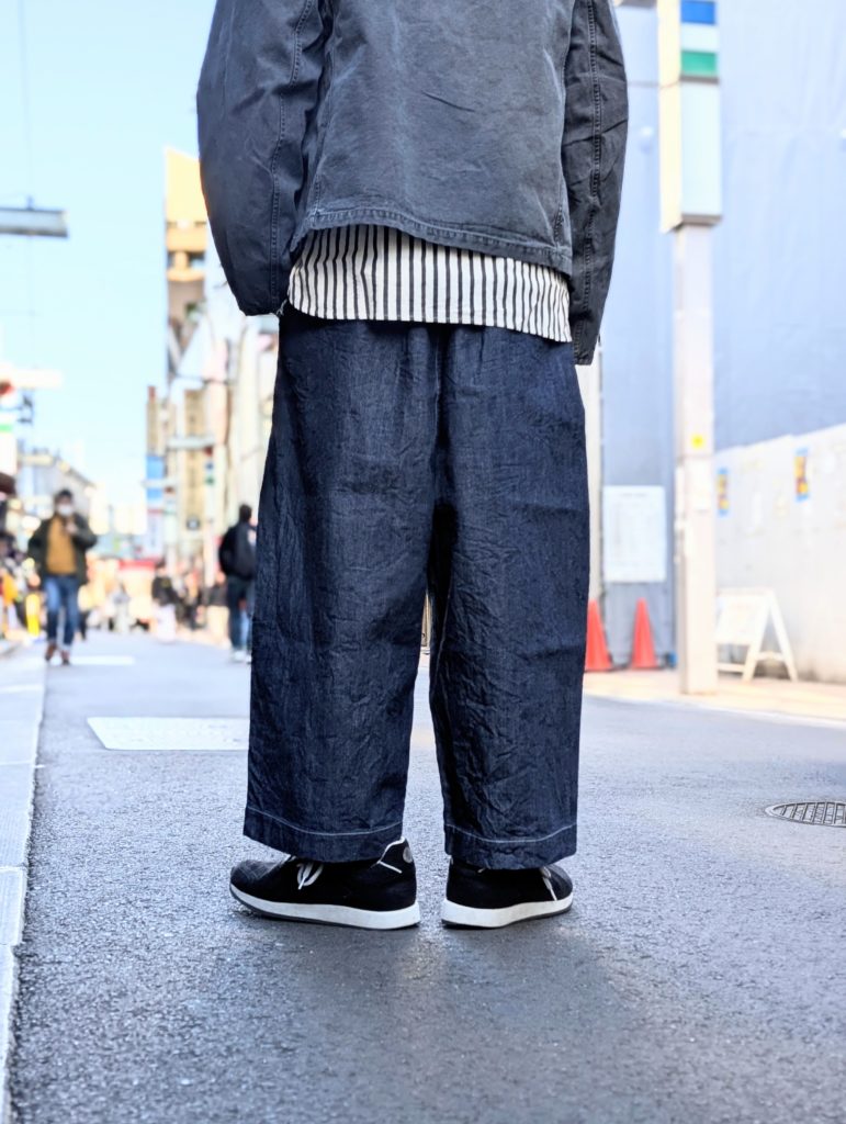 オリジナルのオンブレストライプジャガードを使用したワイドイージーパンツ。