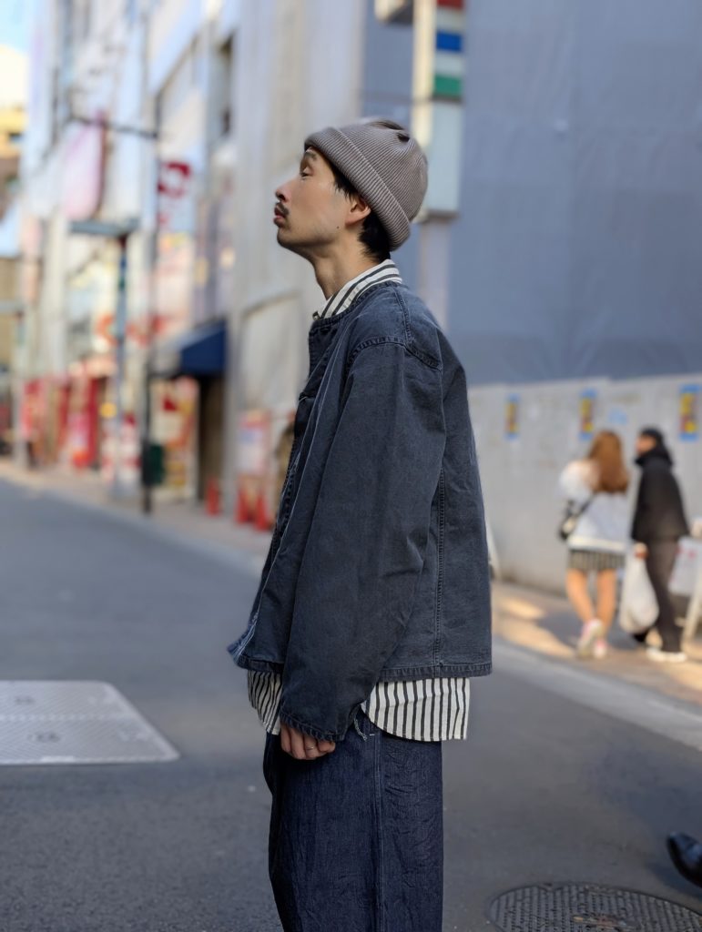 まず今回は、1930年代フランスのノーカラーブルゾンをベースにデザインされた、コットン&ヘンプのオリジナル生地にoutil独自の染色を施した、ショート丈のワークジャケットです。