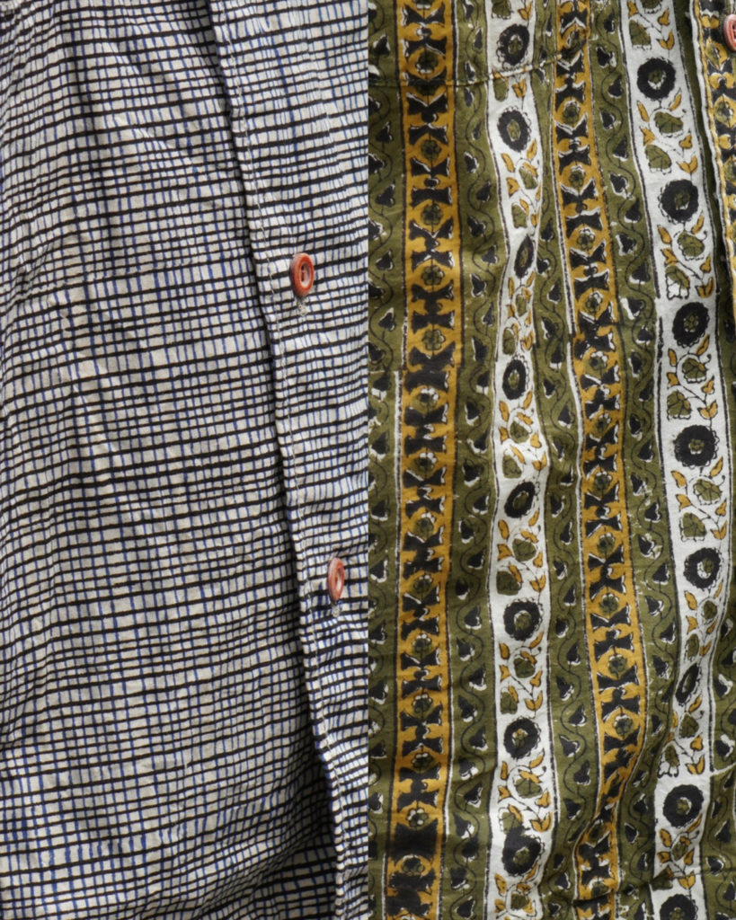 バティック染め生地のオープンカラーシャツ。