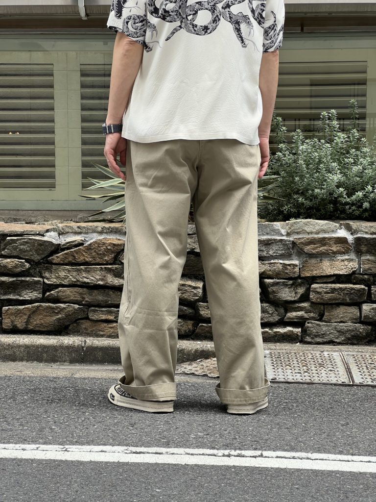 2本針巻き縫いの縫製仕様やメタルボタンの使用、極細の玉縁ポケットなど1942モデルのミリタリーチノのディテールを踏襲。