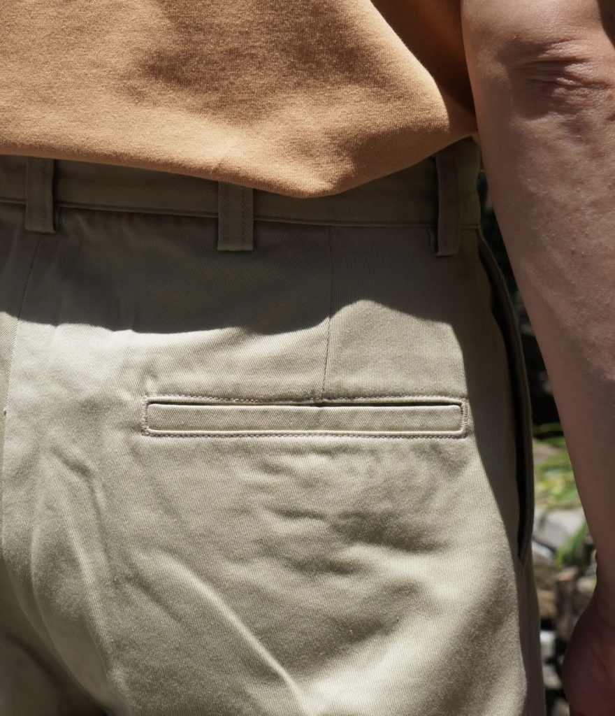 リサイクルポリエステルの外側をオーガニックコットンで覆った二層構造のカバーリングコアヤーンを使用し、クラシックなチノ素材を製作。