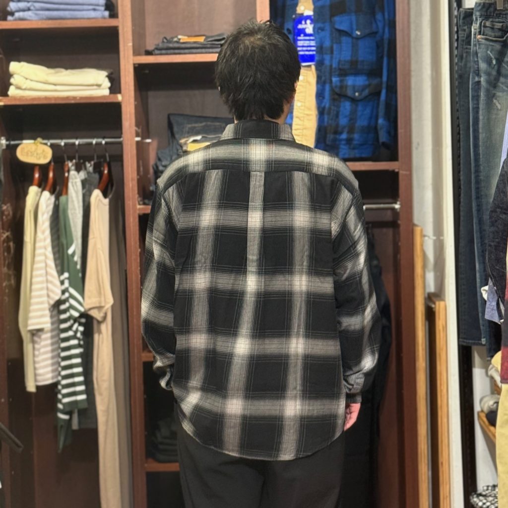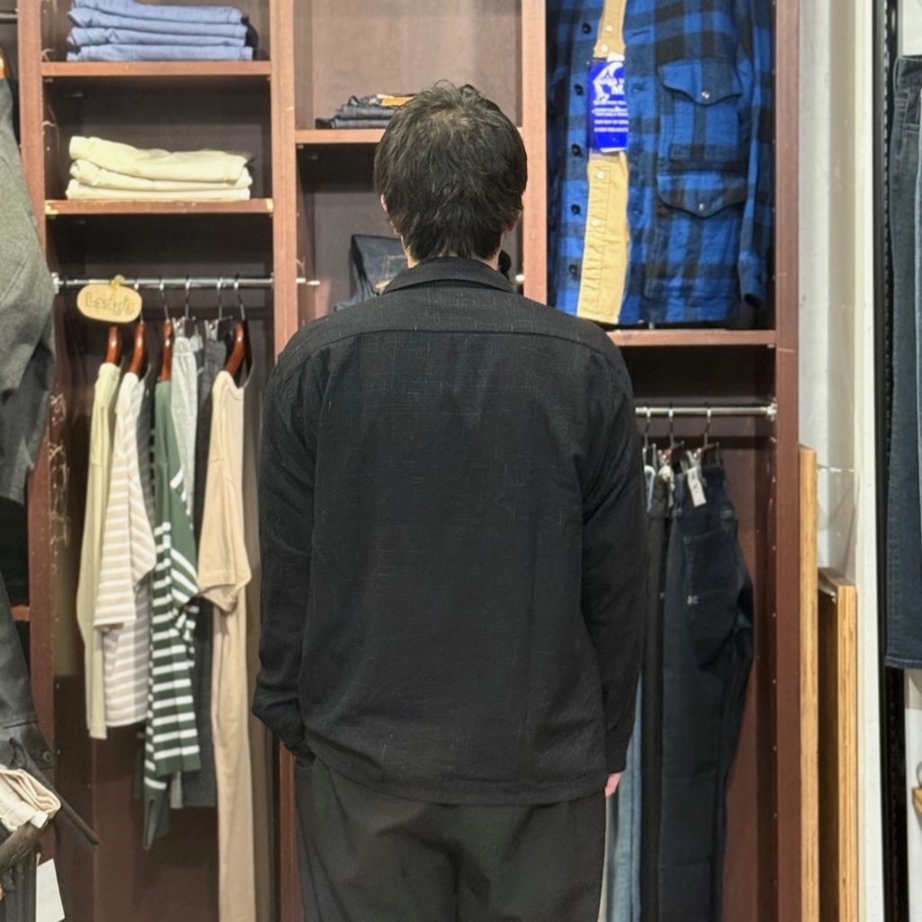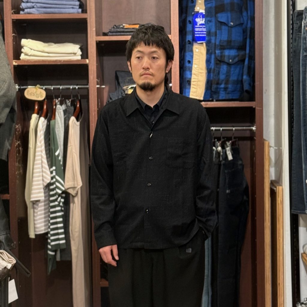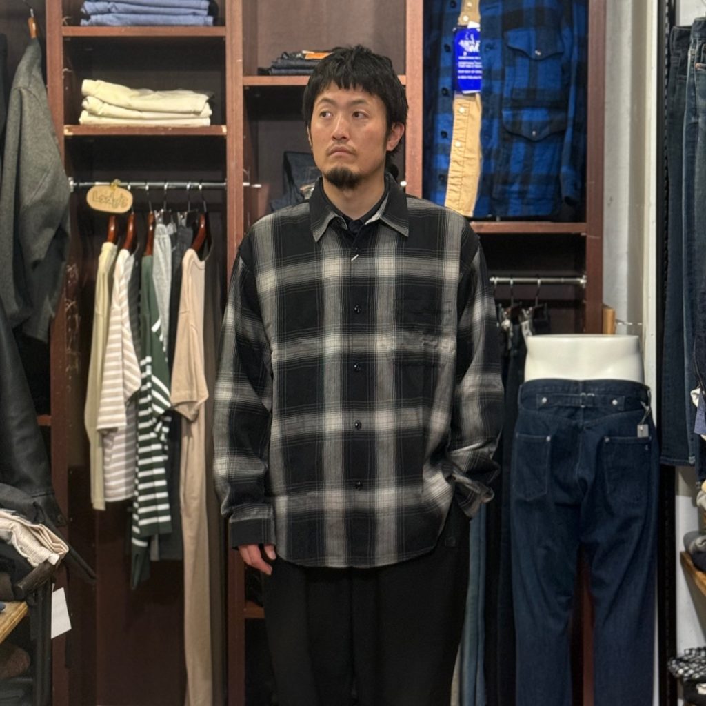 BLACKは絣りチェック、定番のボックス型オープンシャツに仕上げています。