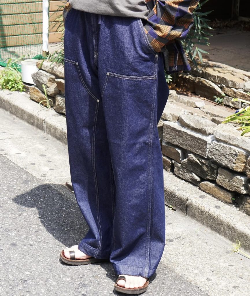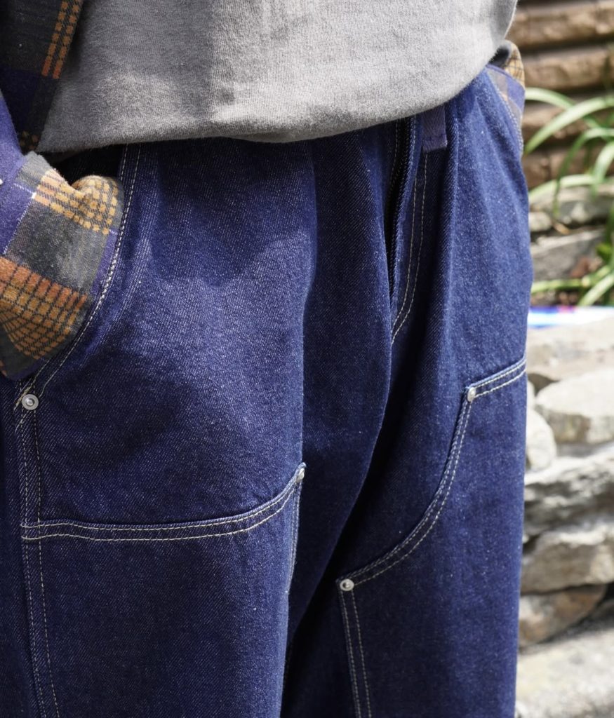ダブルニーパッチを裾まで伸ばした、ワイドシルエットのデニムパンツ。