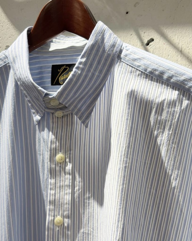 ハリ感のあるコットンタイプライターのストライプ生地を使用したタブカラーシャツ。