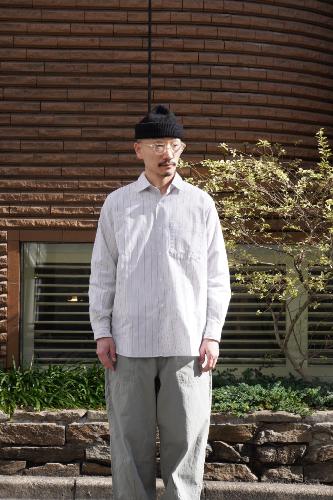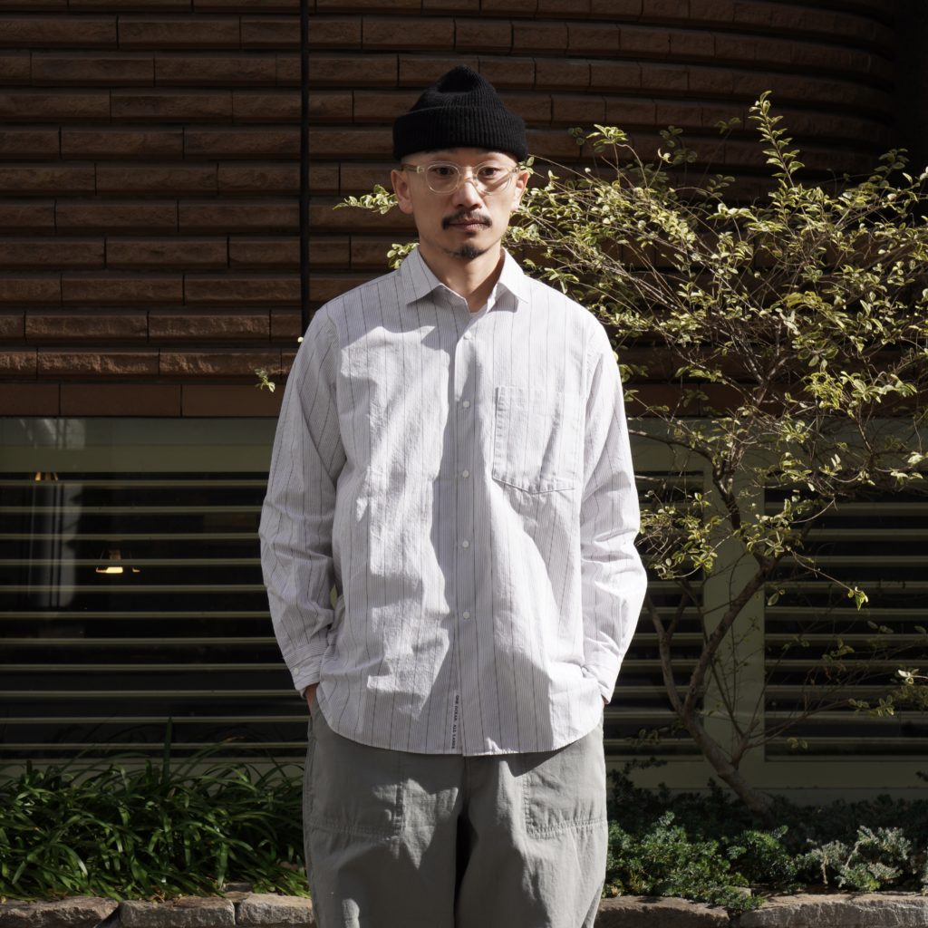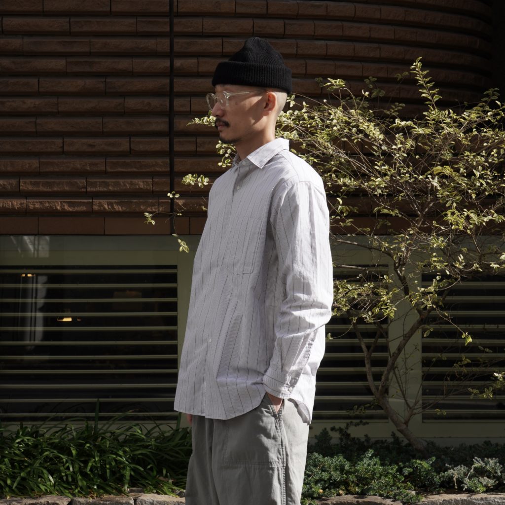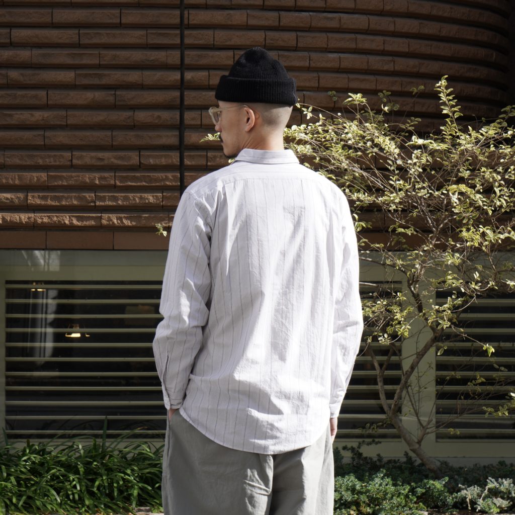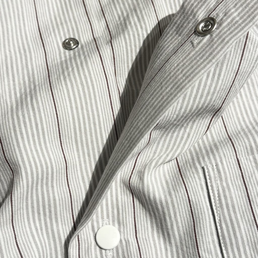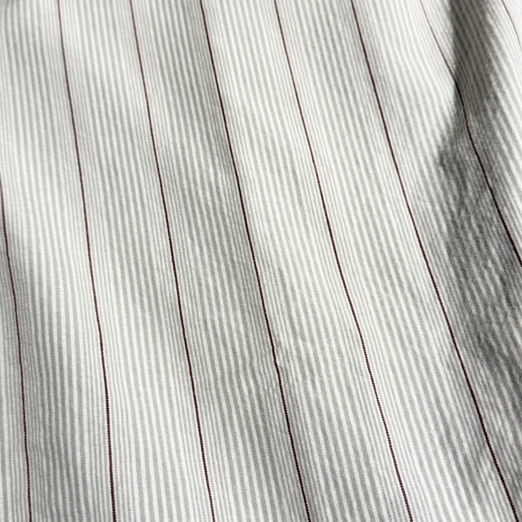 ポリエステルの外側をオーガニックコットンで覆った二層構造のカバーリングコアヤーンを使用し、高密度に織り上げたブロードクロスを製作。