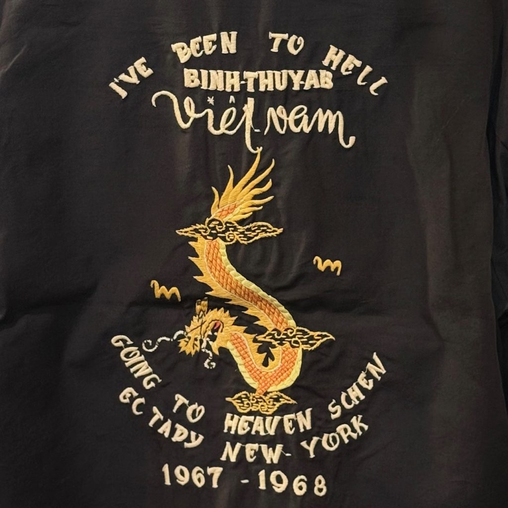 背面に大迫力の龍のモチーフをレイアウトし、ヴィンテージ系のフォントでVietnamと刺繍されています。