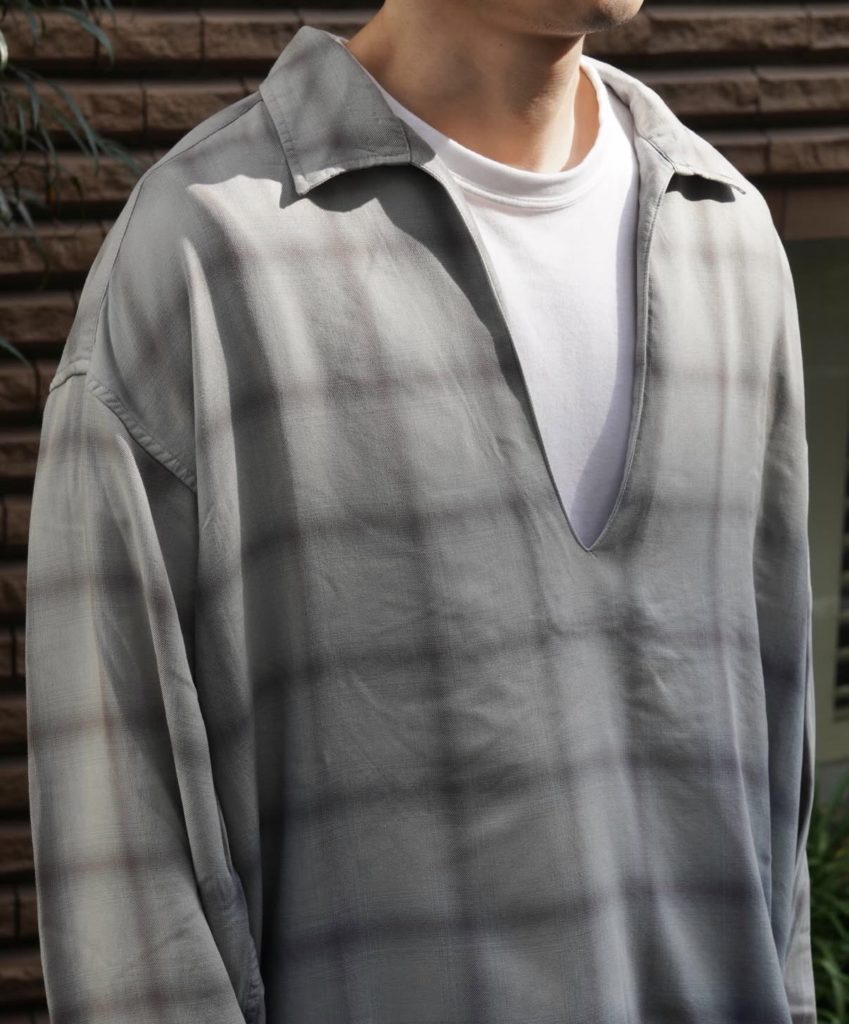 滑らかなテンセル素材にオーバーダイとフェード加工を施し、奥行きのあるチェック柄と自然なヴィンテージ感を引き出している。