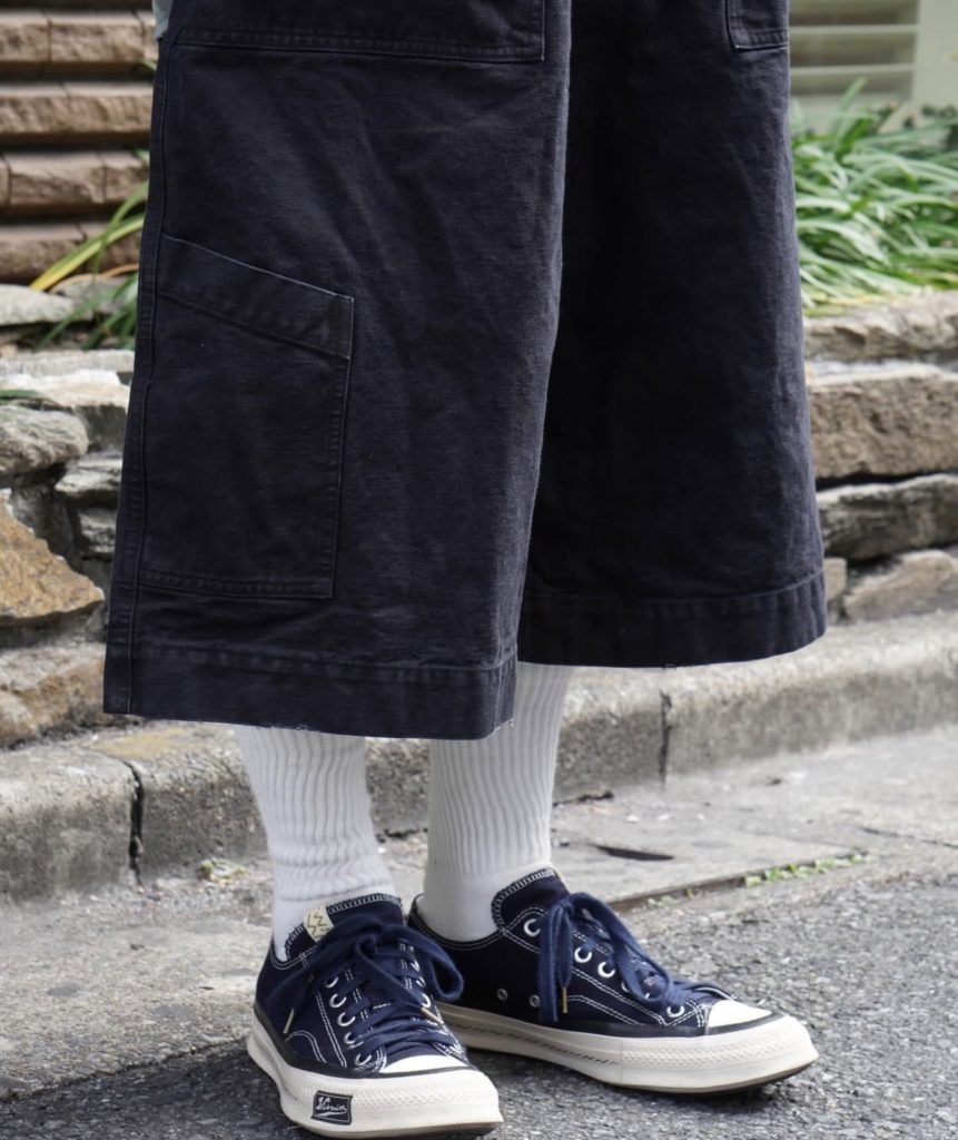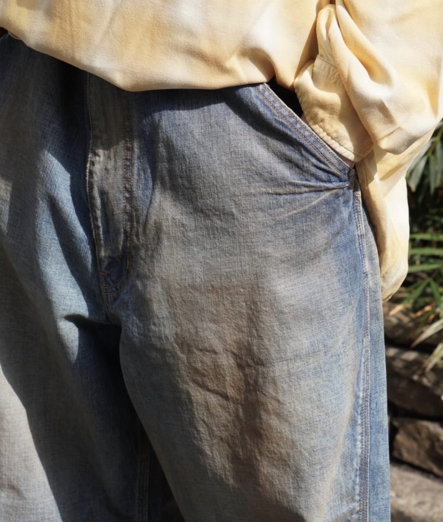 ブラックとライトグリーンにはブリーチ加工を、アイボリーには手作業によるペンキ飛ばしを採用しています。素材のハリと加工の粗さが生み出すコントラストが、着こなしに奥行きを与えます。