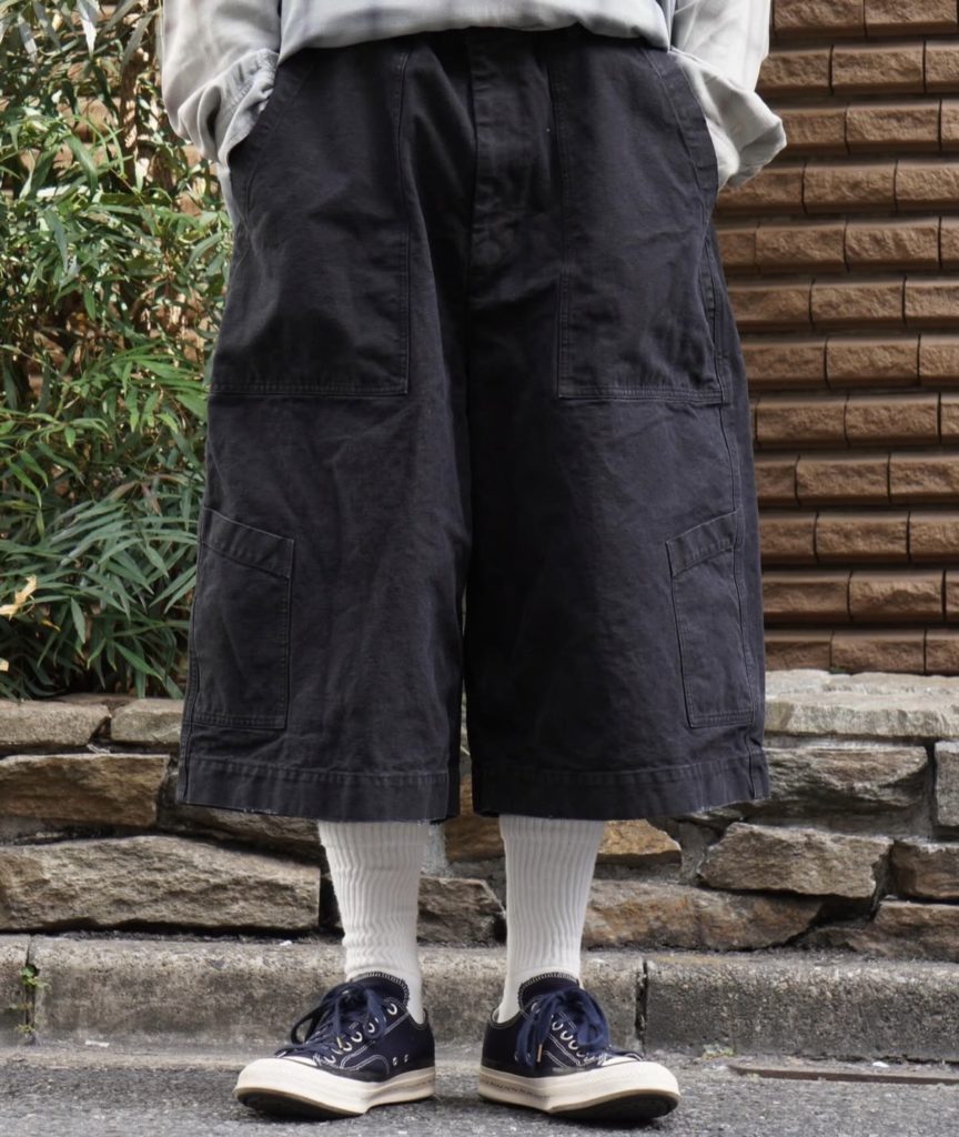 タフなダック素材に、染め・ダメージ加工・ストーンウォッシュを施したロング丈のショートパンツ。