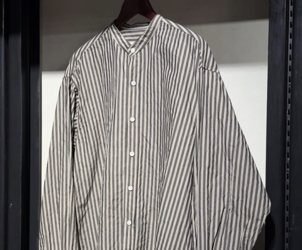 異なる番手の上質な極細コットン糸を使用し織り上げ、しっかりと洗い込む事でタテ糸の収縮差でナチュラルなサッカー状に仕上げたストライプ素材。