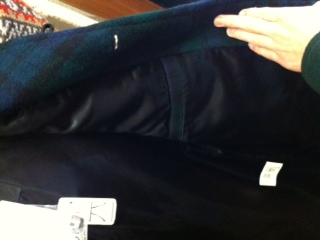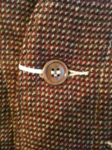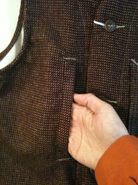 ジャケットのVゾーンが狭く、最終ボタンから裾の長〜い