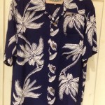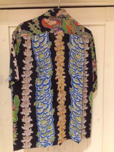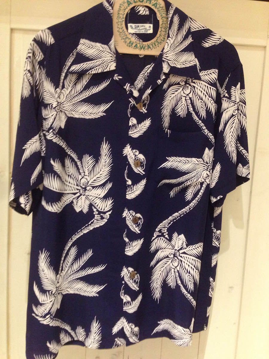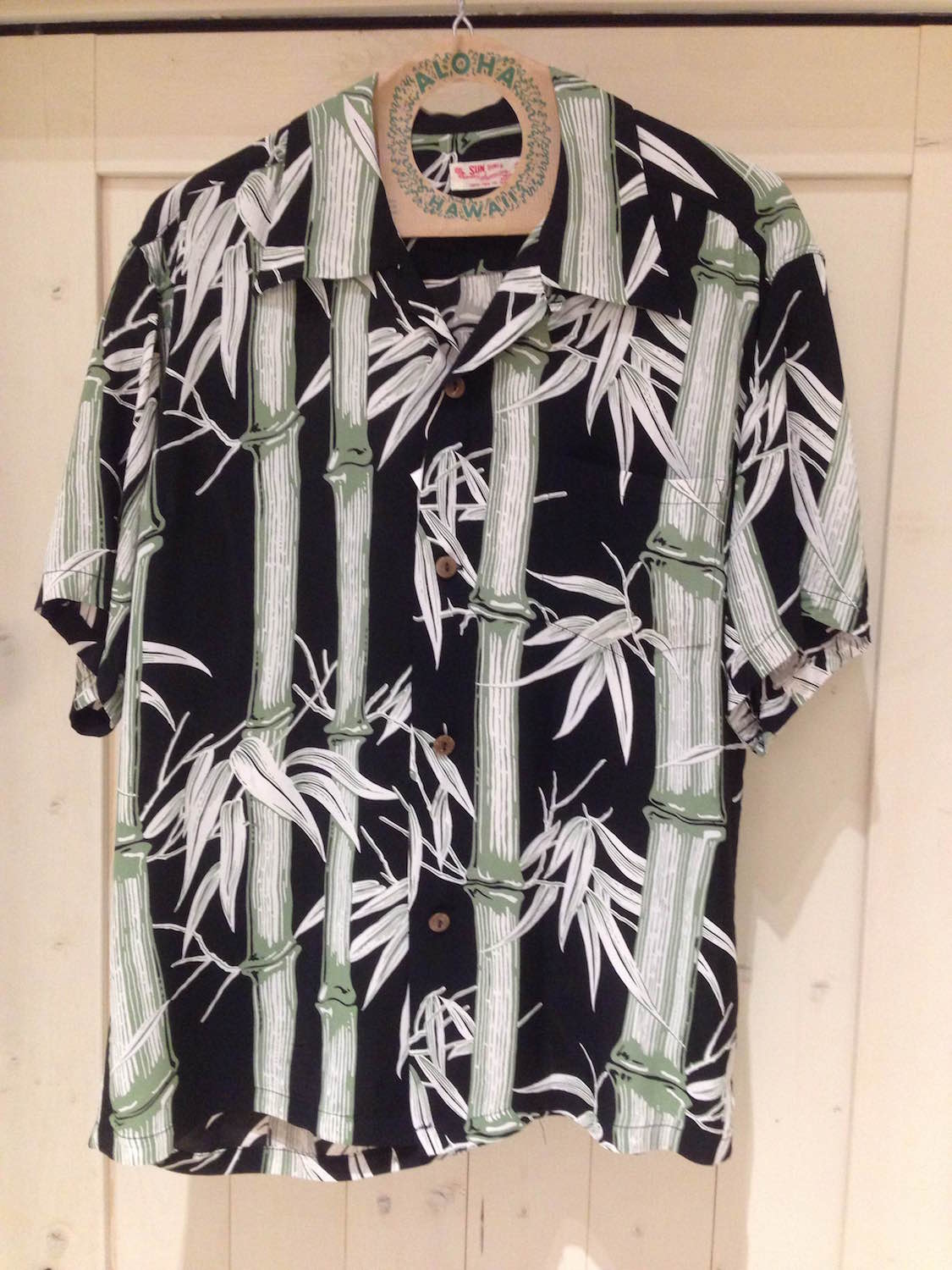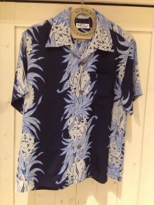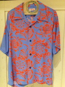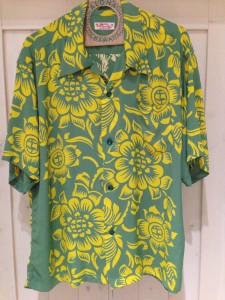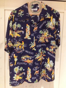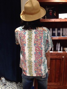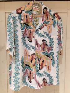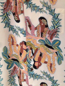シャツ全体に華やかなレイを手にするフラガールが描かれています。