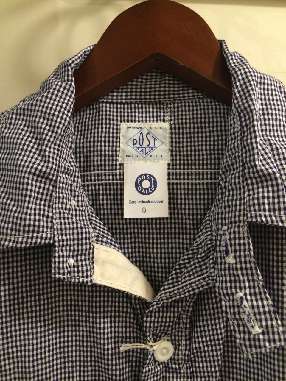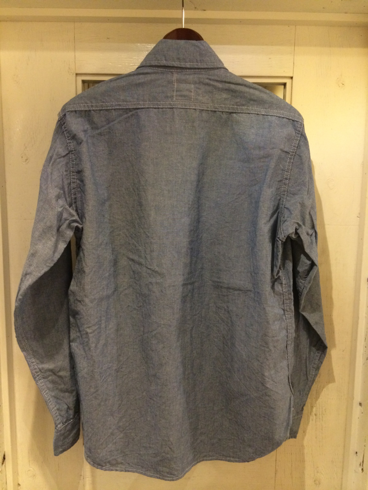 スタンドカラーのシャンブレーも S サイズで着てみました。