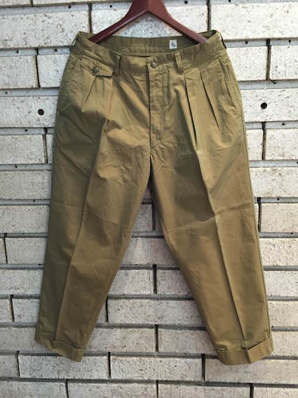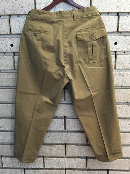 ボリューム感のある2タックトラウザーズ、裾に向かって大きくテーパードしている9分丈レングスです。