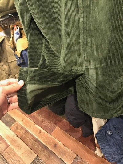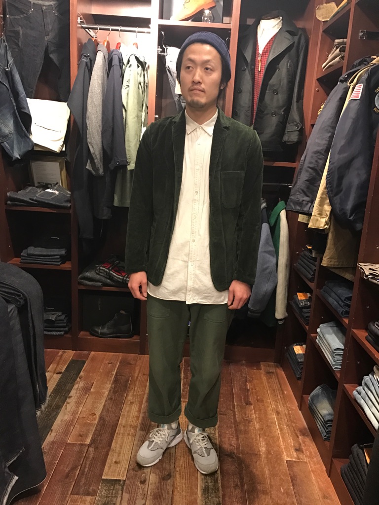 この濃いオリーブの色とこの太畝の生地感との調和が非常に素晴らしいです。