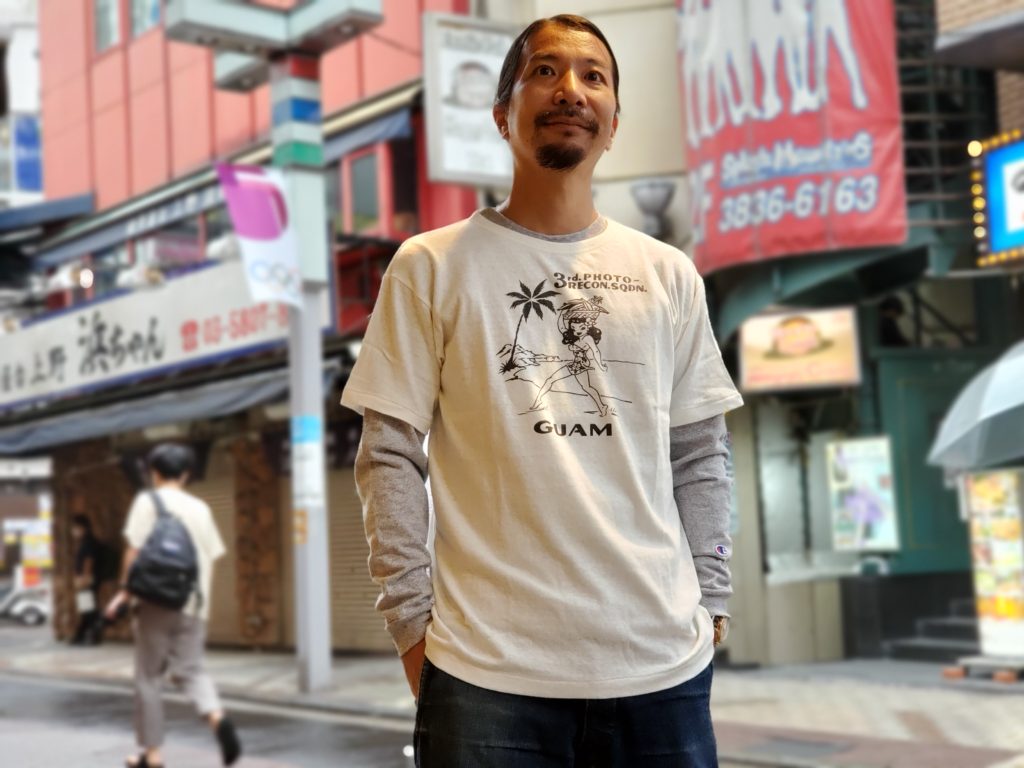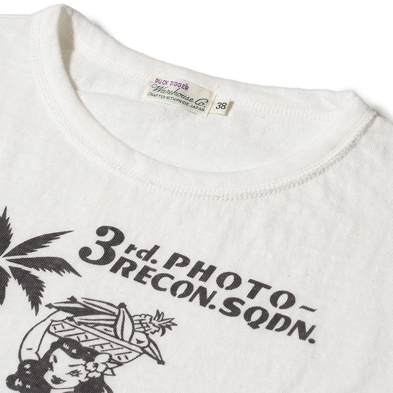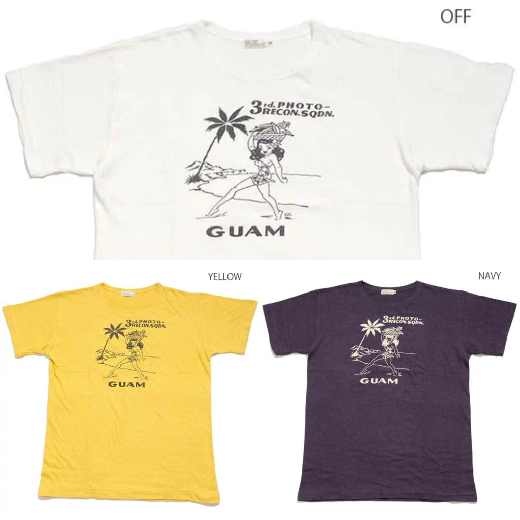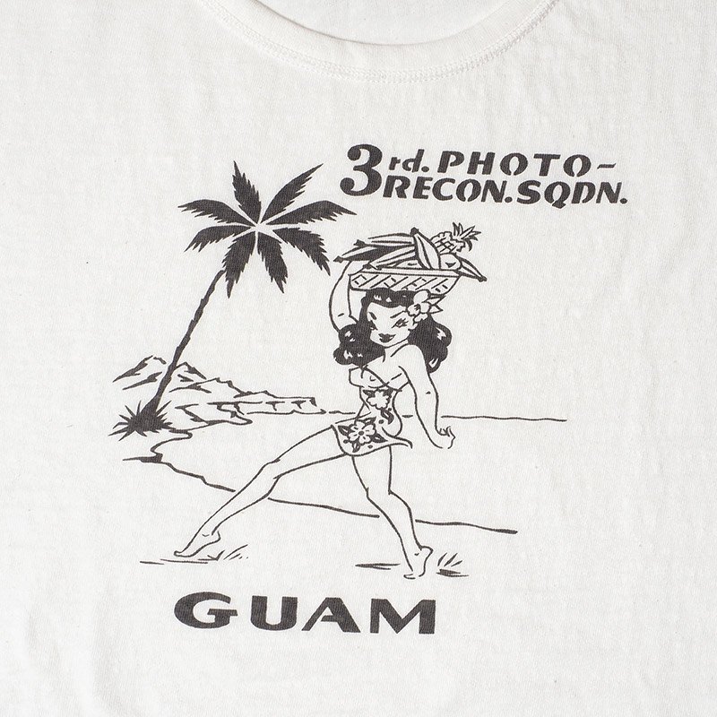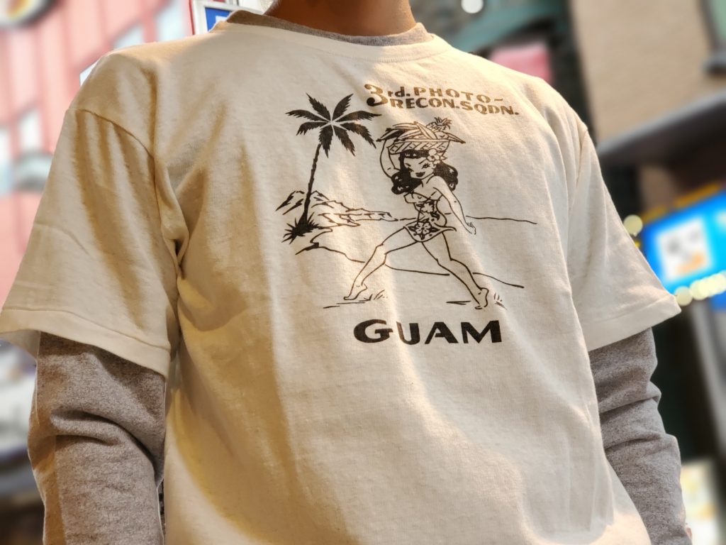 第二次世界大戦に赴いた退役軍人が、その功績を誇りにするため、当時の個人装備の持ち物を大切に所持することは、「A-2」などのフライトジャケットなどで良く知られています。こちらはそのなかでもスーベニア色の強いもので、太平洋戦線上のグアム島空軍基地にあった第3写真偵察中隊(第3PRS)所属したクルーのTシャツです。ミリタリーベースのボディである「スキブ」Tシャツにプリントを施したイメージで再現しています。