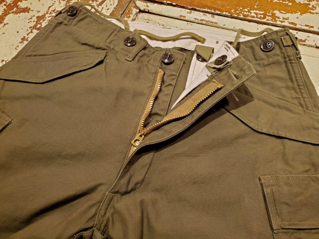 1950年代にアメリカ陸軍が防寒用野戦装備として採用したM-1951トラウザース。素材はM-65やM-51パーカーにも用いられているバックサテンを採用。コットンながら肉厚で、優れた耐久性を誇る。オーバーパンツとして作られたM-1951。動きを妨げないようシルエットはゆったりと太い。ウエストのアジャスターやサイドポケット内の止血帯に膝のプリーツなど、後継のM-65と共通点は多いものの、サスペンダーボタンやサイドが巻き縫いになっているなどの差異にも注目を。