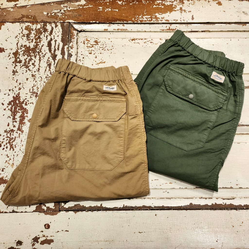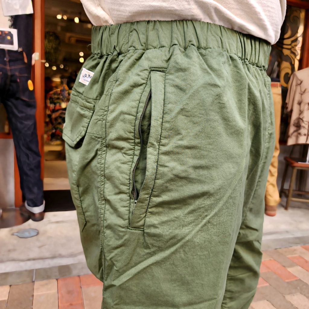 バックポケットは安心感のあるスナップボタン付きのフラップポケット、サイドポケットにはジップ仕様を採用。ワンポイントのスピンドルがアウトドアウェアを彷彿とさせます。