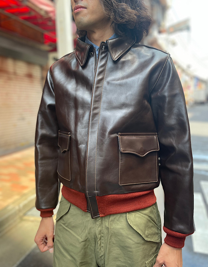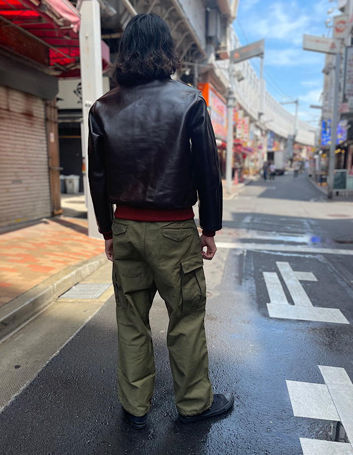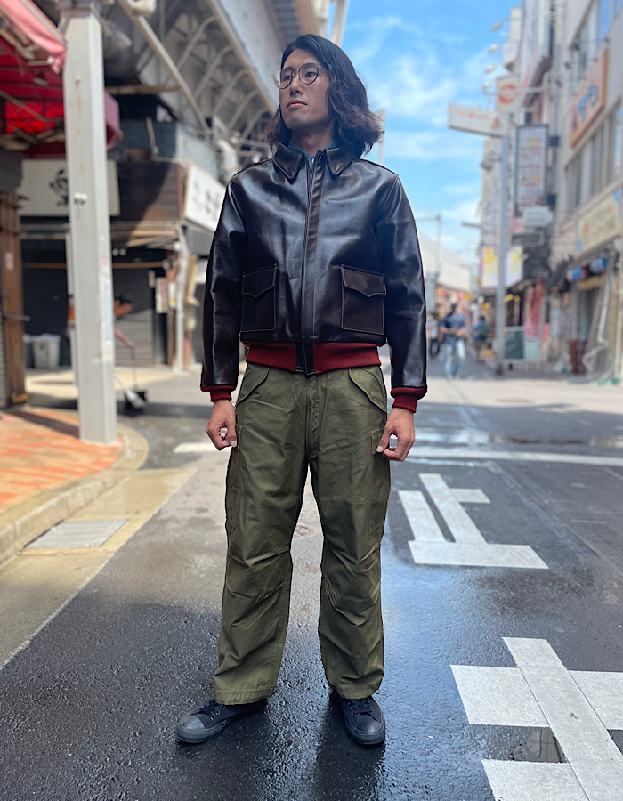 A-2エアロレザーにM51パンツを合わせたこれぞミリタリーアメカジの憧れですよね。いつかは手にしたいレザーアイテム。ぼくもまだ手にしていませんがエアロレザー社と言えばこの赤リブ。やっぱいいですよね。コーディネートのアクセントになるリブの差し色がどんなアイテムを合わせてもより一層おしゃれになりますよね。