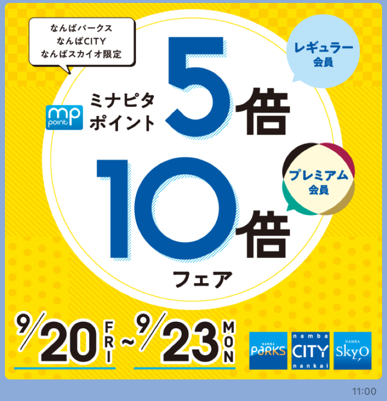 来週9/20(金)〜9/23(月・祝)の4日間、HINOYAなんばパークス店があるなんばパークスではミナピタポイント5倍10倍フェアを開催します‼️