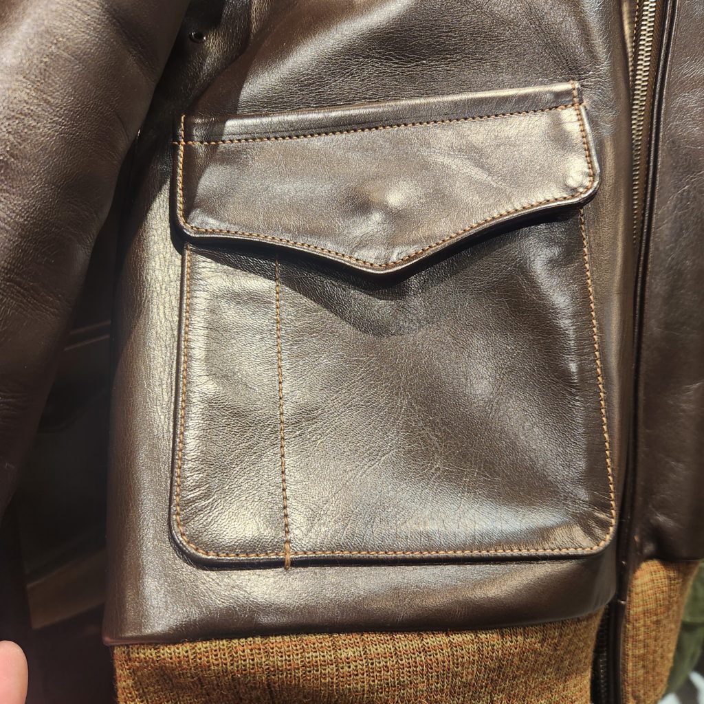 ベースはJ.A.デュボウ社が手掛けた1941年12月契約のモデル。台襟が無いシャープで美しい襟元が特徴的。ボディはブロンコハイド。仕上げはアニリンではなくピグメントフィニッシュ。アニリンフィニッシュの美しいシワ感も捨てがたいものがありますが、水分に比較的強いピグメンドフィニッシュの方が雨など天候を気にせず、長く愛着を持って着て頂けると思い、今回はこちらを選択しました。