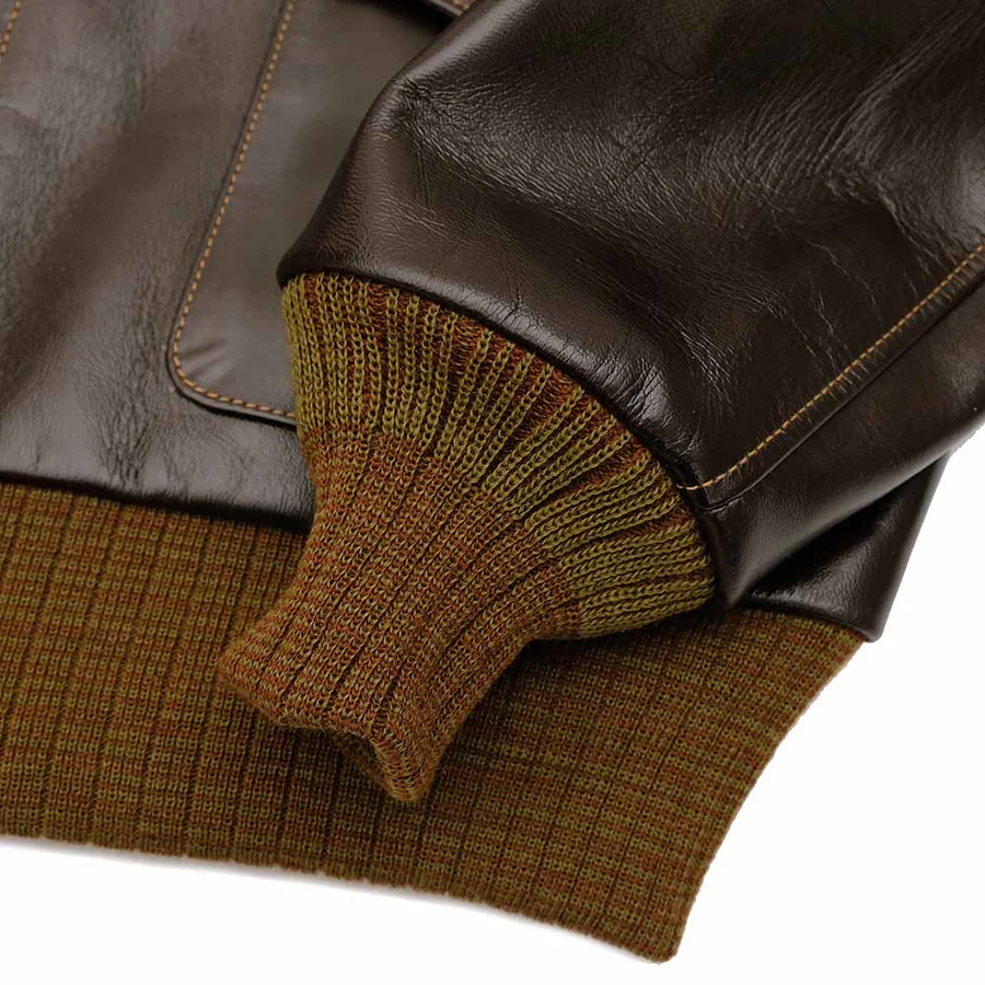 ヒノヤの75周年を記念し、BUZZ RICKSON’Sに別注依頼した特別なA-2が完成。ベースはJ.A.デュボウ社が手掛けた1941年12月契約のモデル。台襟が無いシャープで美しい襟元が特徴的。ボディはフルベジタブルタンニングのブロンコハイド。仕上げはアニリンではなくピグメントフィニッシュ。アニリンフィニッシュの美しいシワ感も捨てがたいものがありますが、水分に比較的強いピグメンドフィニッシュの方が雨など天候を気にせず、長く愛着を持って着て頂けると思い、今回はこちらを選択しました。リブはオリーブとブラウンミックスの針抜きリブを採用し、右ポケットにはペンホルダーを設けるなど、当店の創業時をイメージし、よりクラシックな雰囲気を求めてA-1のエッセンスも加えました。