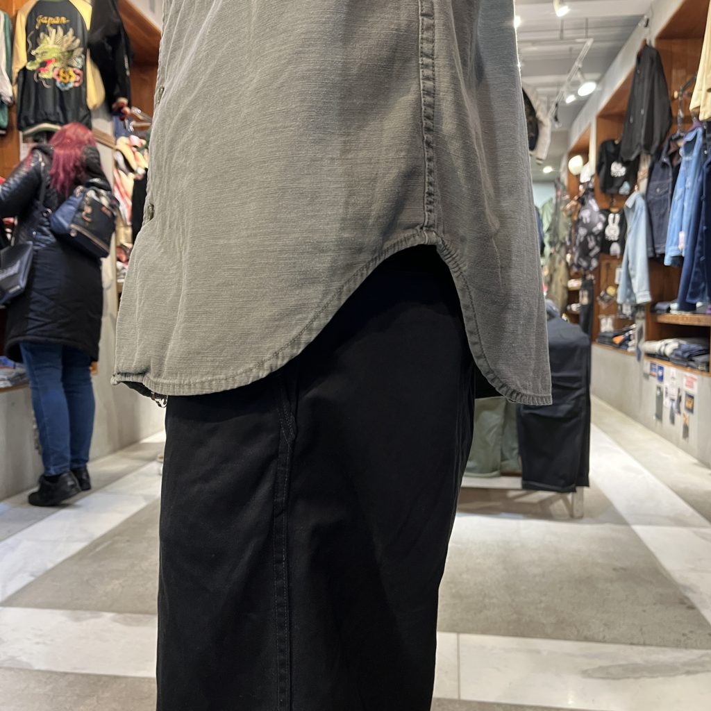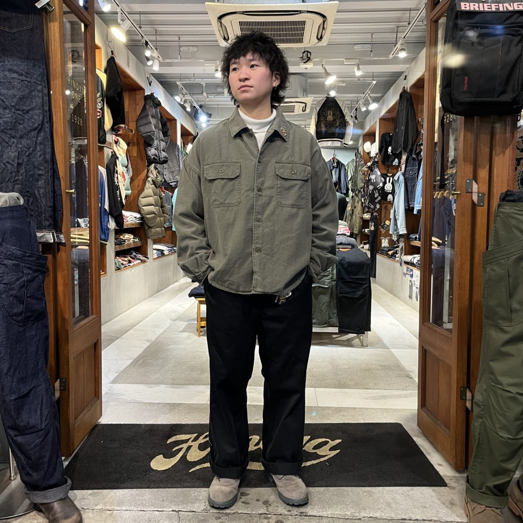 レミならではのどこにも左右されないデザイン、ミリタリーでは中々ないワイドシルエットでも丈はスッキリとしているのでジャケットや、Tシャツに合わせやすい商品となっています。