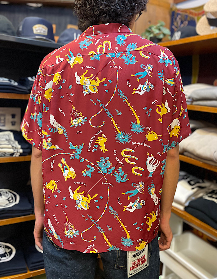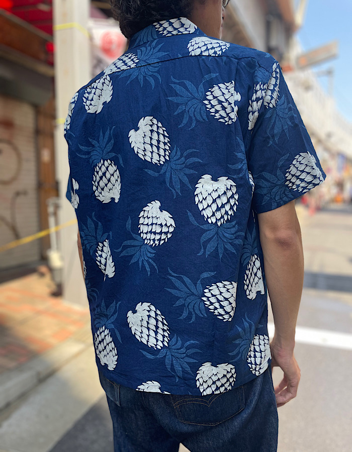 インディゴの濃淡のグラデーションでヴィンテージアロハシャツの柄を再現しつつインディゴ染めなので経年変化も楽しめる1着ですよ。コットンポプリンの張りのある生地感はレーヨンでは感じれない着心地がありますよね。