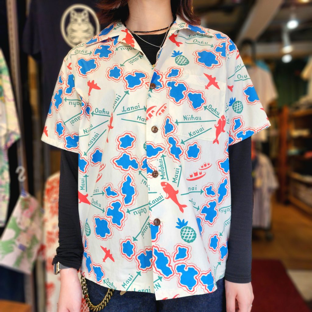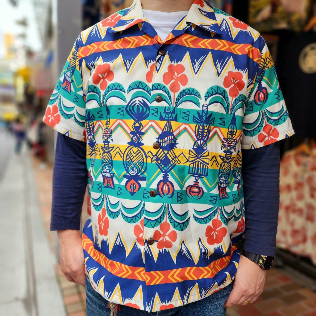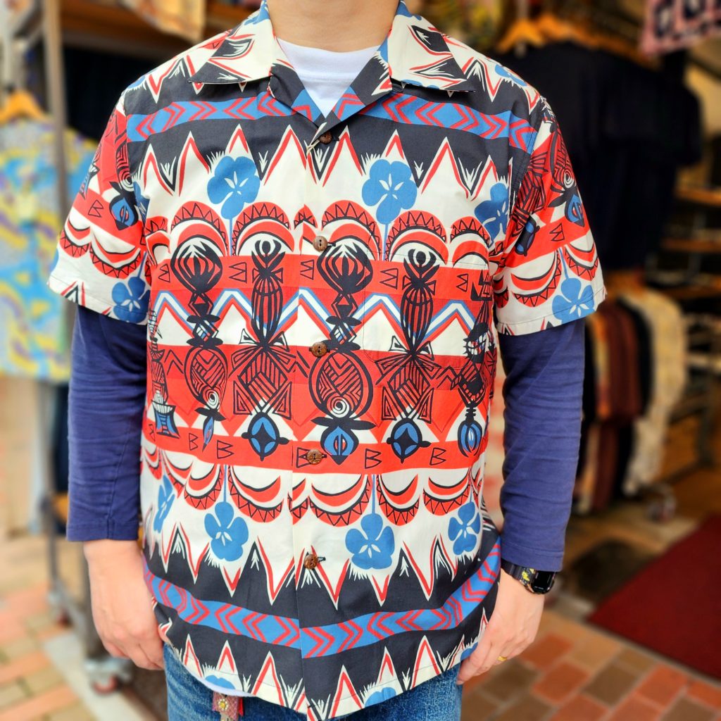 1900年代初頭に創業したボタニック・マニュファクチャリング社のブランド、ドリフトウッドが1950年代中期に手掛けた一枚。同社はシアトルに本拠地を置き、ワークウェアをはじめとする様々なアイテムを展開していた。当時、アメリカ本土でのポリネシアン・カルチャーの人気が高く、リゾートシャツとして海やビーチを連想させるモチーフで構成されたシャツが多く作られていた。