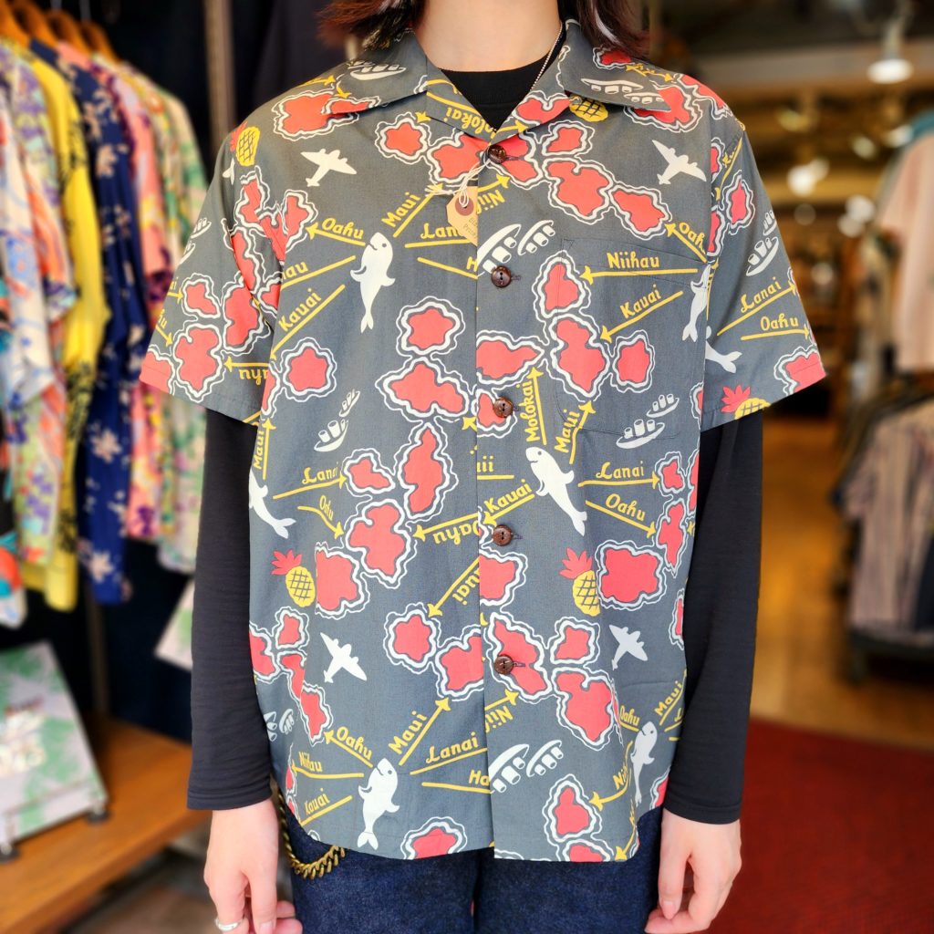 1936年にハーブ・ブライナーが15人の工場からスタートし、1945年にはハワイ島ヒロに従業員200人の大規模な工場を作り、名実共にアロハシャツメーカーのトップに立ったカメハメハ・ガーメント社。このシャツは同社が1950年代中期に手掛けた作品で、サンサーフとしては初の復刻となる。12月から3月頃までの間、ザトウクジラが繁殖、出産や子育てのためにハワイにやってくる。そのクジラたちが島々に向かって遊泳する進路が描かれている。