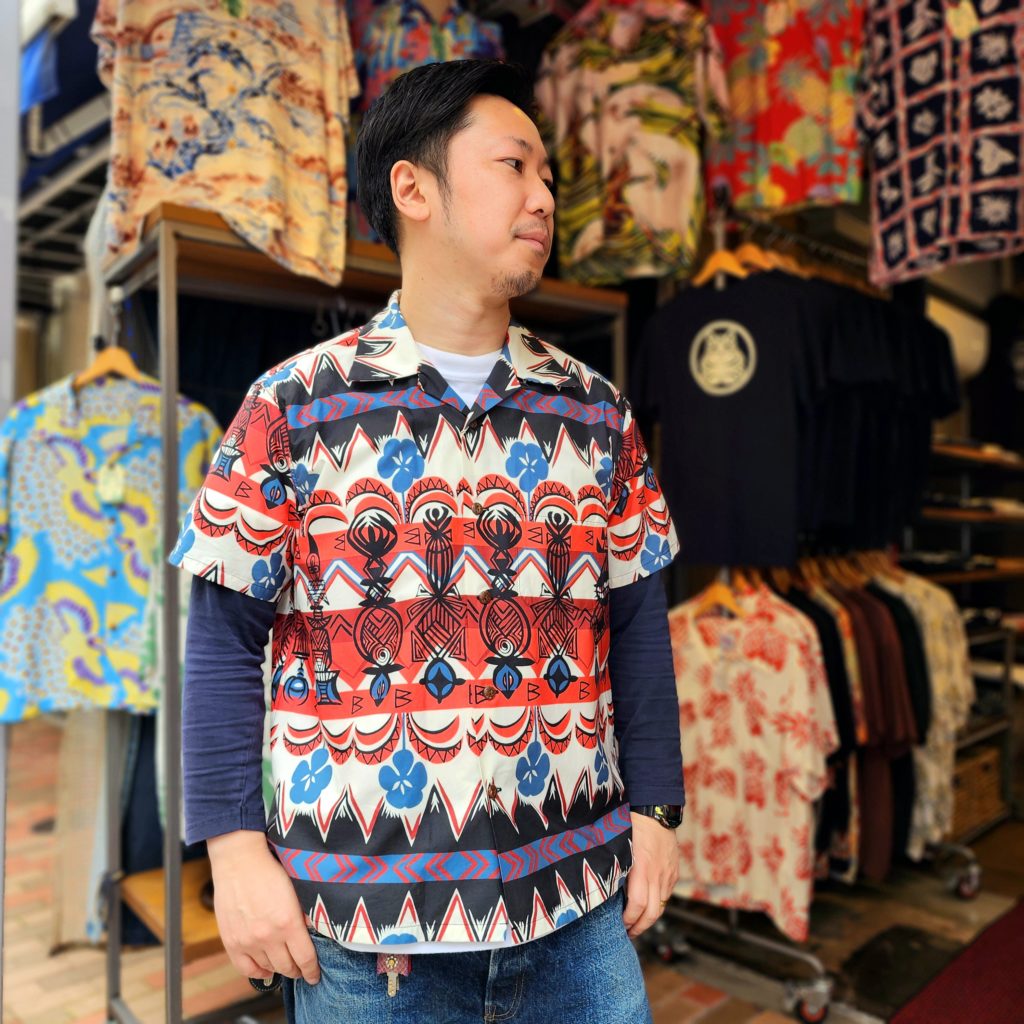 1950年代後期に製作されたコットン素材のシャツを現代に蘇らせた一枚。オリジナルを手掛けたのは、ハワイアンシャツの全盛期を築き上げたブランド、ワットムルス。異色かつ大きな成功も収めたとして有名な、インド系移民のG・J・ワットムルが1913年に創業したイースト・インディア・ストアが展開していたブランド。ティキやヤシの木などをデフォルメして描いたモチーフがボーダー状に配された珍しい一枚。