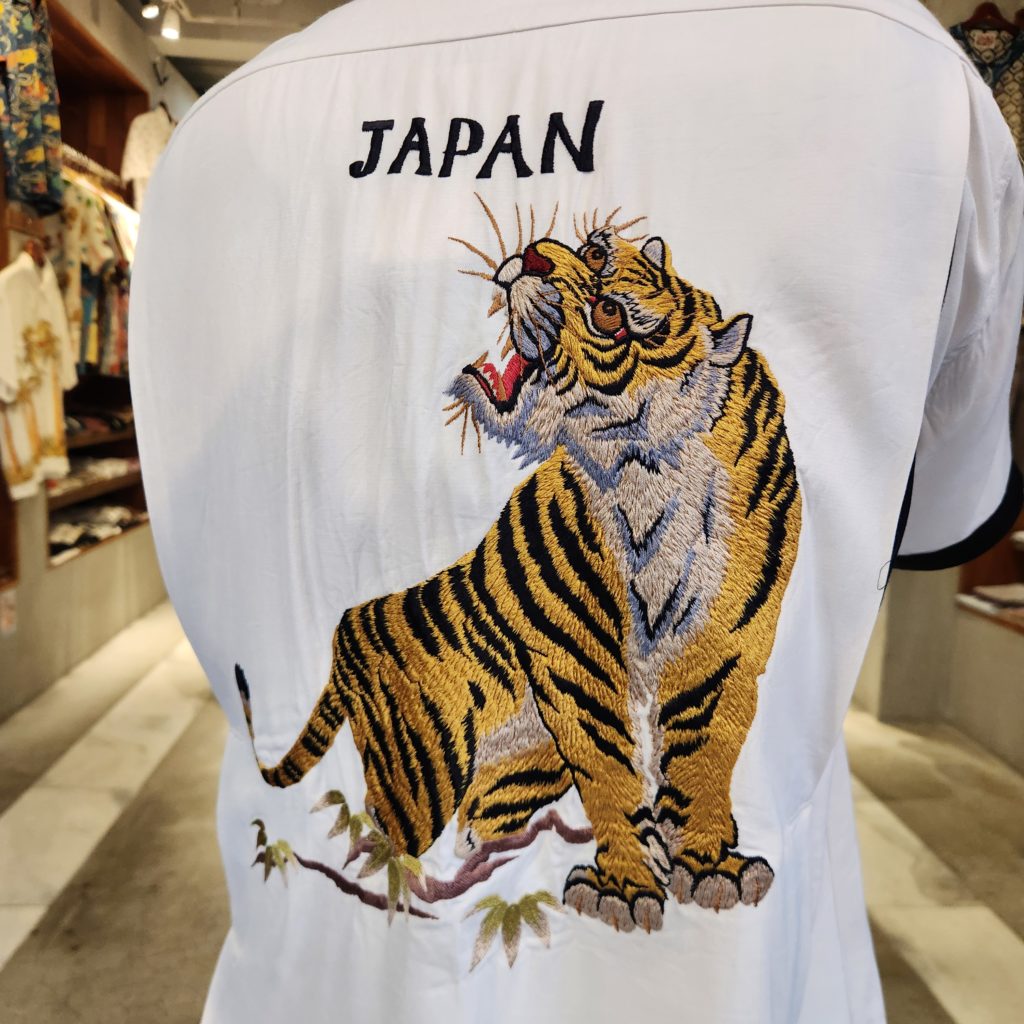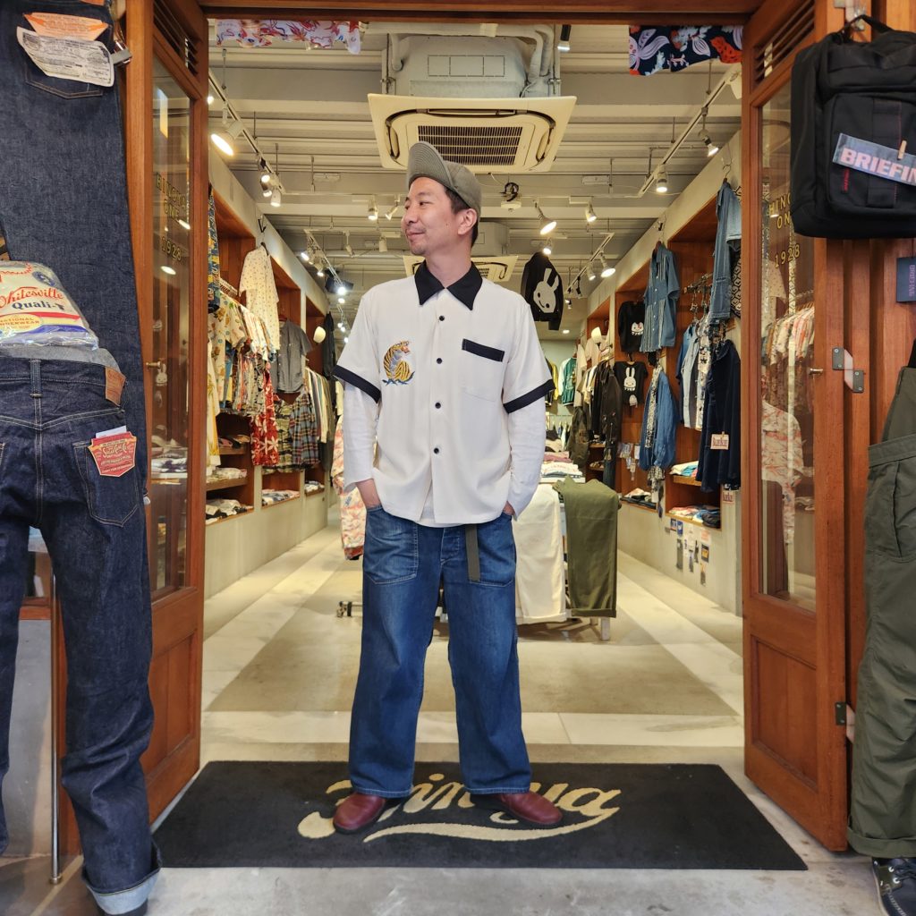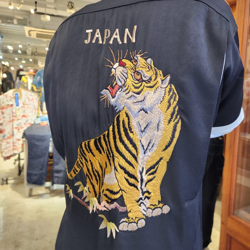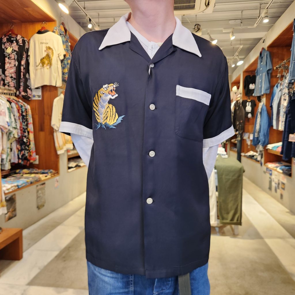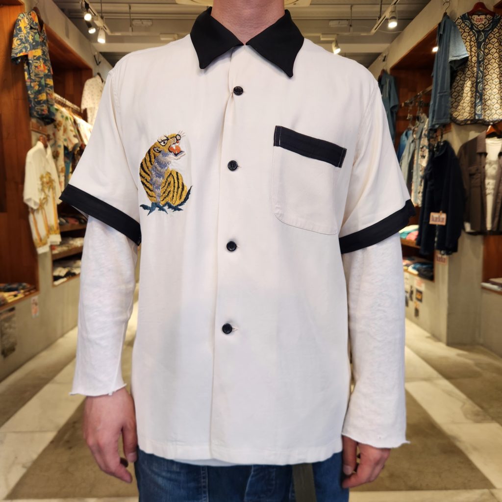 1950年代にスカジャンに描かれた図案をボウリングシャツ型へ落とし込んだ一着。襟や袖口、アクションプリーツの色を身頃と切り替えることで、デザインのアクセントとしているのも特徴。軽やかなレーヨン素材のため、夏場でも気軽にスカジャンの雰囲気を味わえる一着に仕上がった。