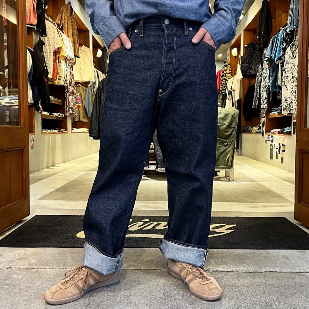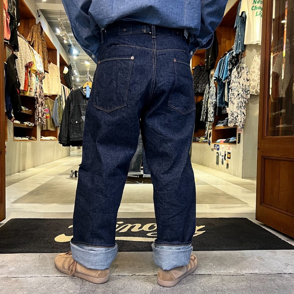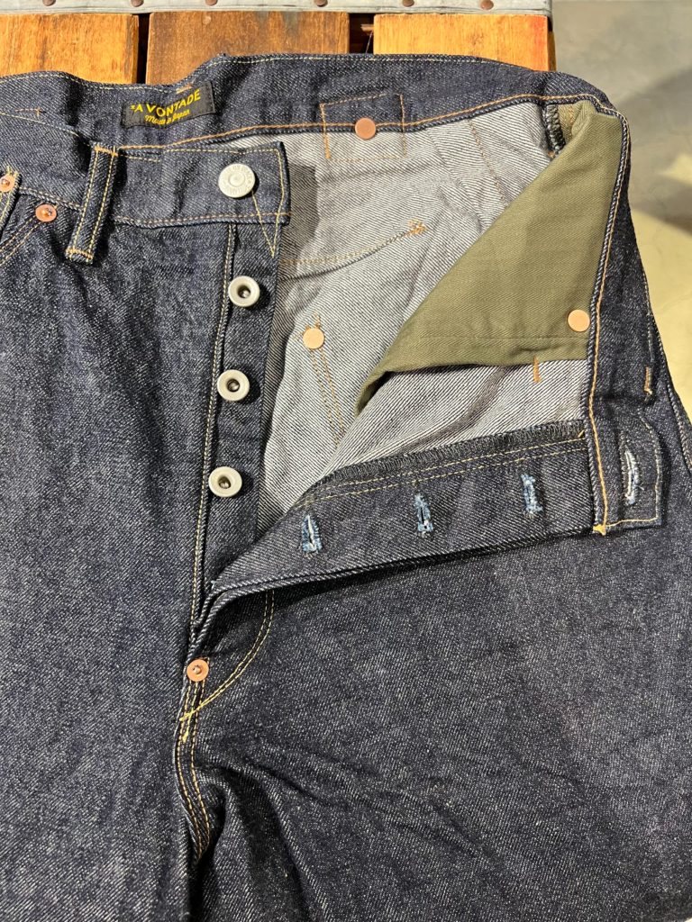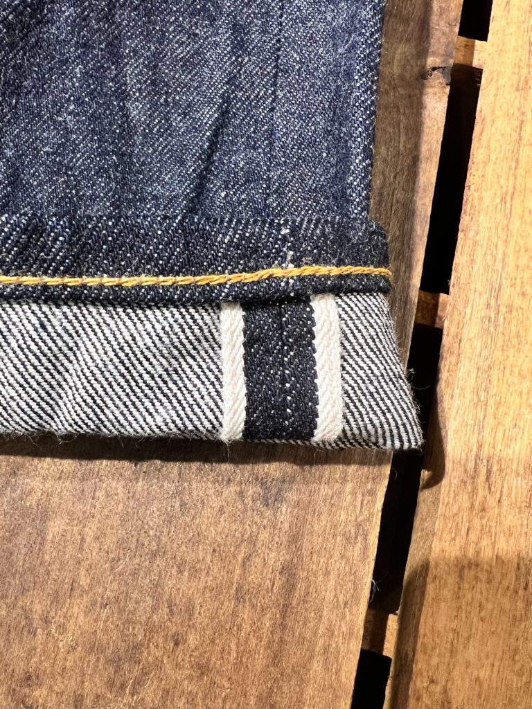 素材・生地】オリジナルで作成した13.5ozのデニム。経糸にジンバブエの長綿、緯糸には品種改良される前の天然の茶綿を使用し、シャトル織機で丁寧に織り上げています。表面の毛焼き加工をせずに、製品洗いで少し捻れがでるように特殊なサンフォライズ加工を入れています。ヴィンテージに寄せる為に特注で作られたこの生地は、特殊な防縮加工を施してあるため縮みは最小限に、ねじれと毛羽立ちはヴィンテージ同様に発生します。深みのあるインディゴの色合いと控えめな縦落ち感が特徴です。