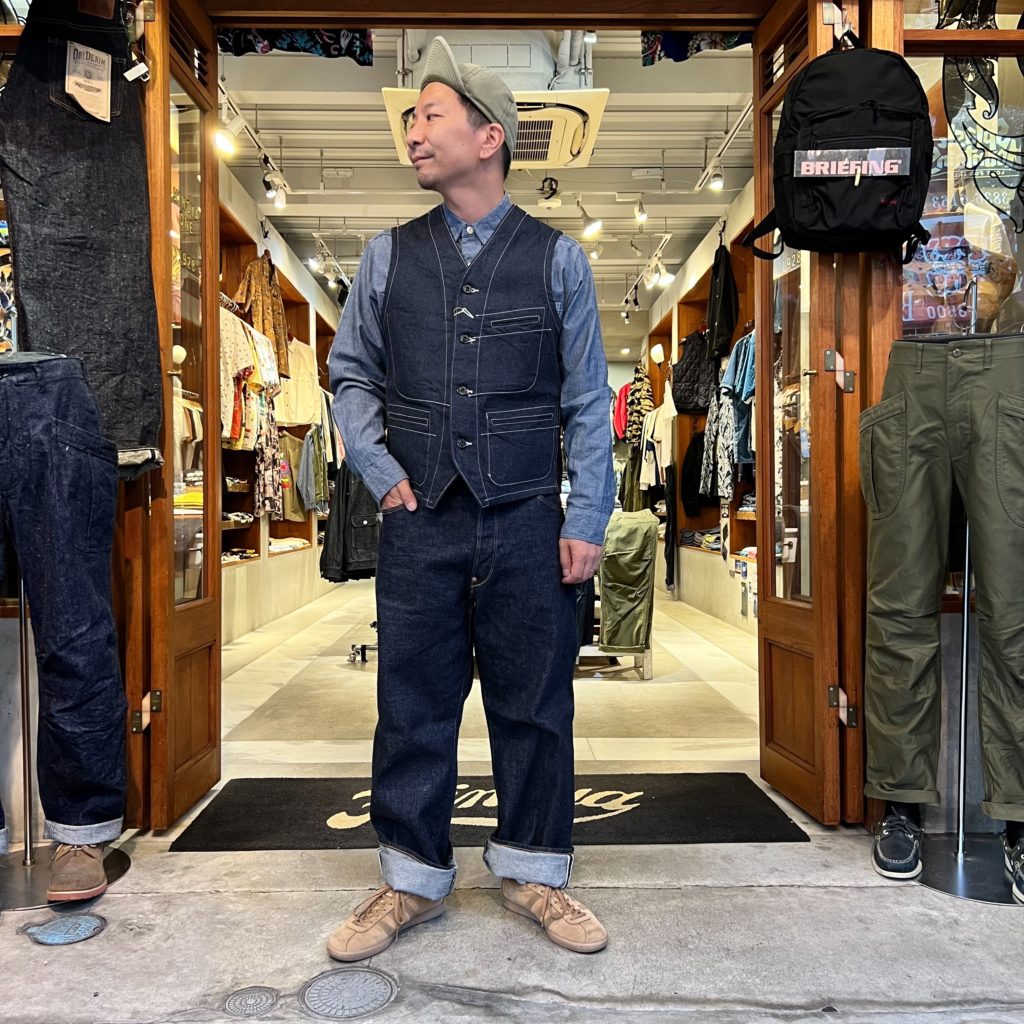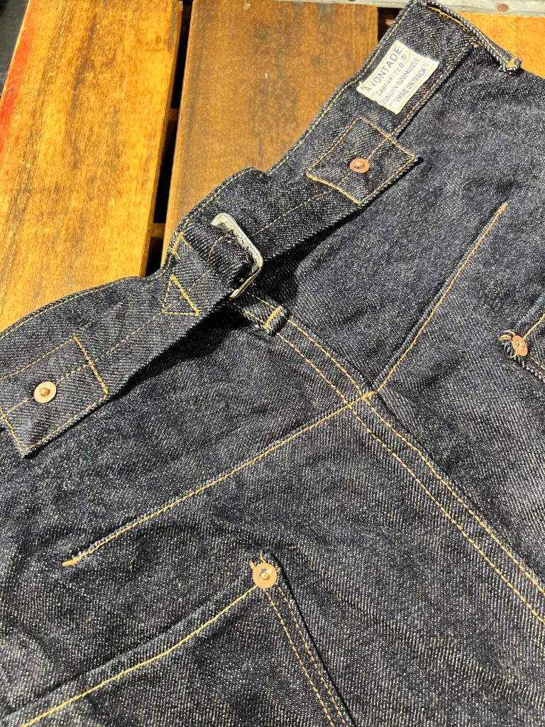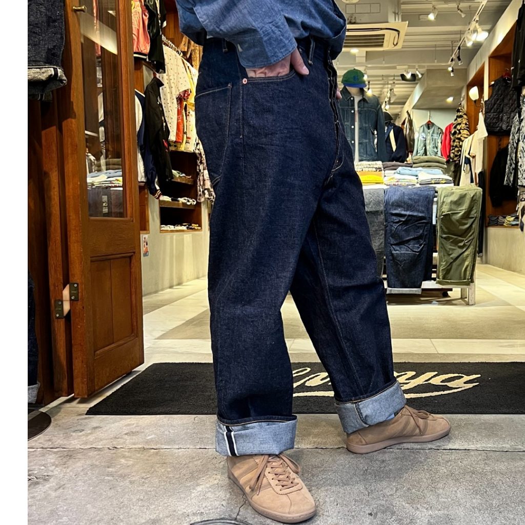素材・生地】オリジナルで作成した13.5ozのデニム。経糸にジンバブエの長綿、緯糸には品種改良される前の天然の茶綿を使用し、シャトル織機で丁寧に織り上げています。表面の毛焼き加工をせずに、製品洗いで少し捻れがでるように特殊なサンフォライズ加工を入れています。ヴィンテージに寄せる為に特注で作られたこの生地は、特殊な防縮加工を施してあるため縮みは最小限に、ねじれと毛羽立ちはヴィンテージ同様に発生します。深みのあるインディゴの色合いと控えめな縦落ち感が特徴です。