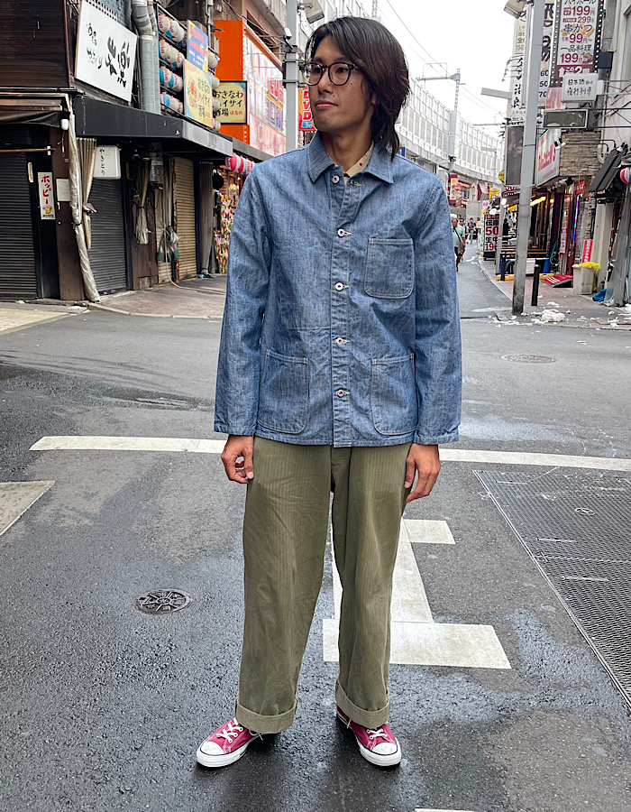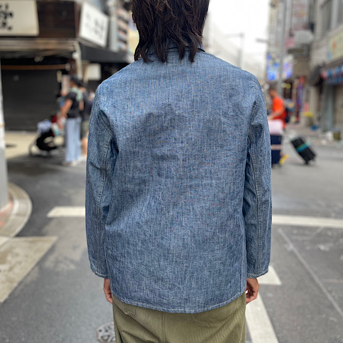 王道のカバーオールでありながらシャンブレーを使用した何とも爽やかなジャケット。シャンブレーでありながらも13ozのデニムにも匹敵するしっかりとしたハリ感を持ちながら、シャンブレー特有の軽やかさと着心地を両立。