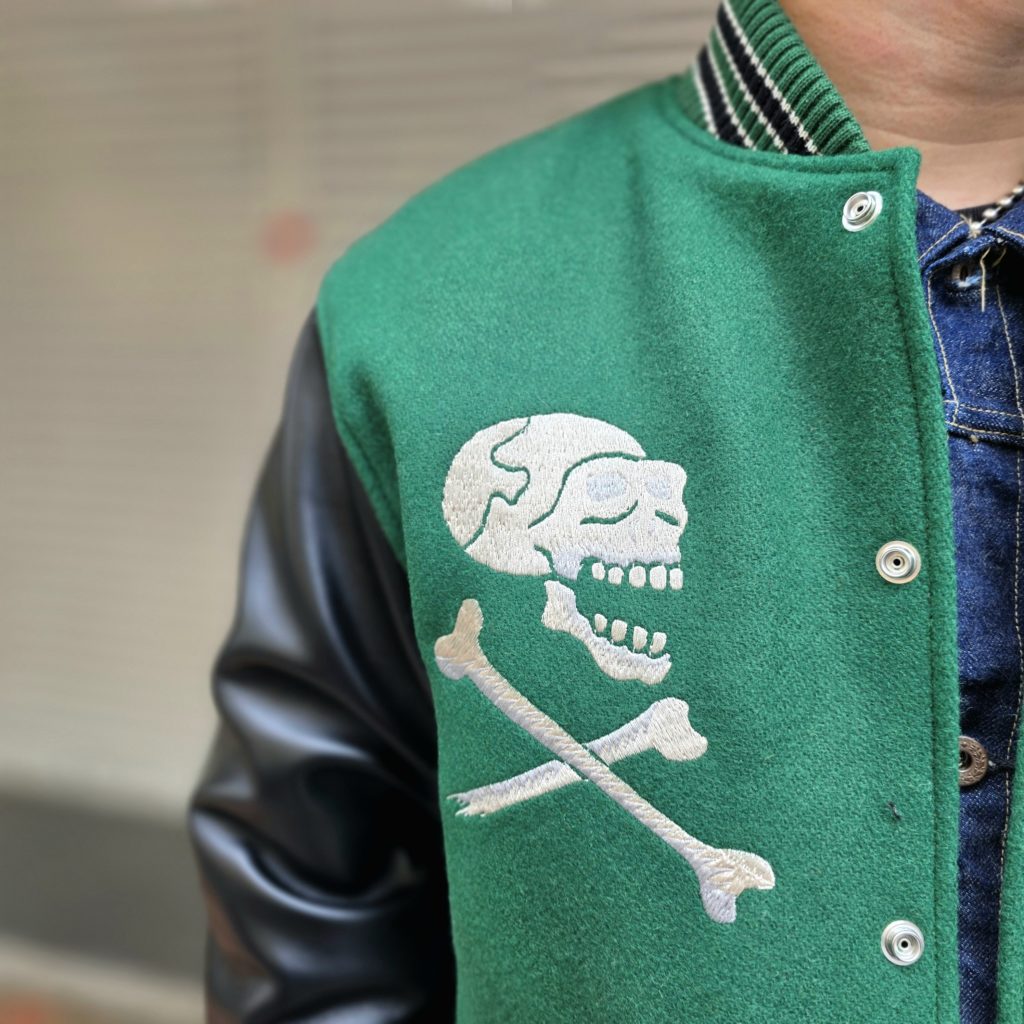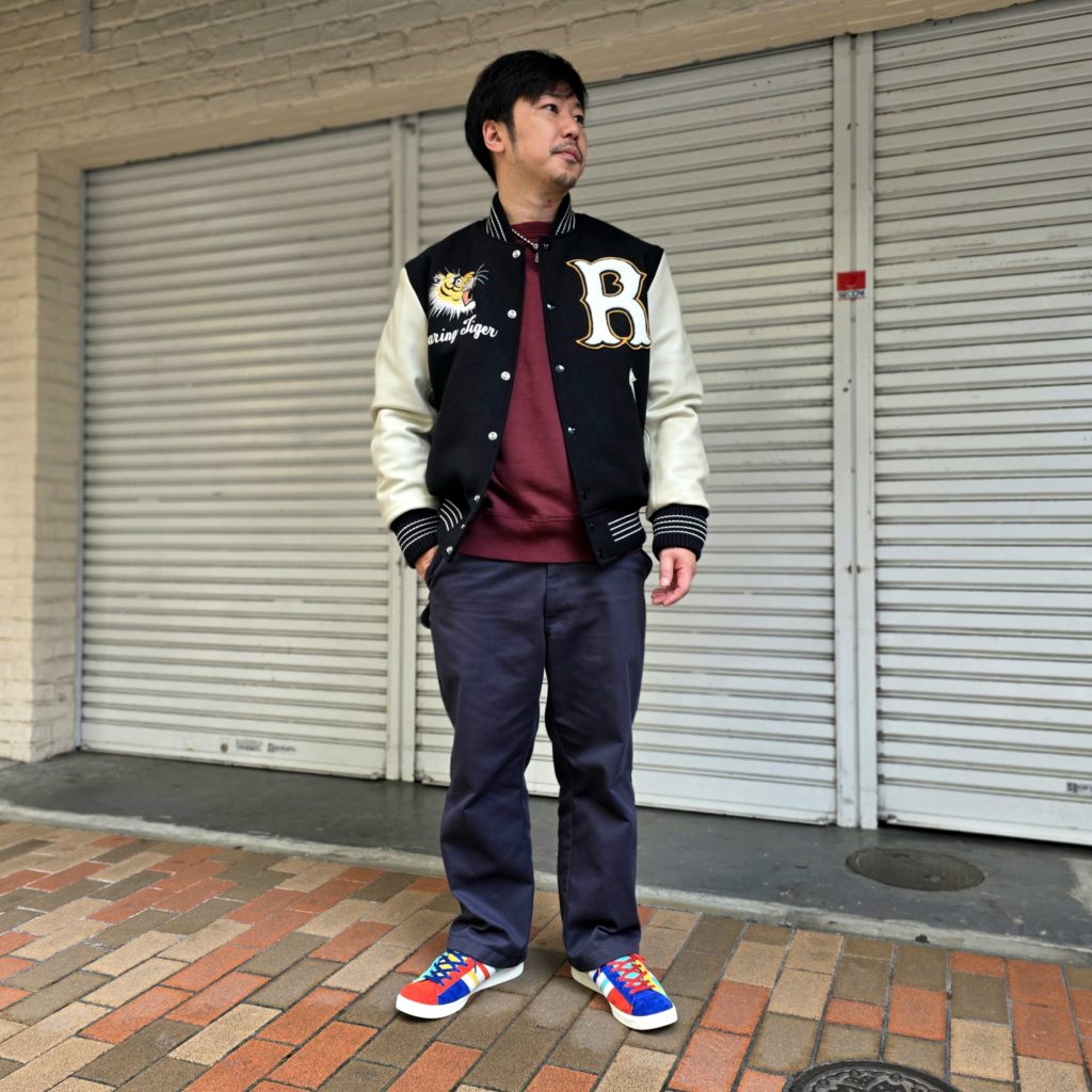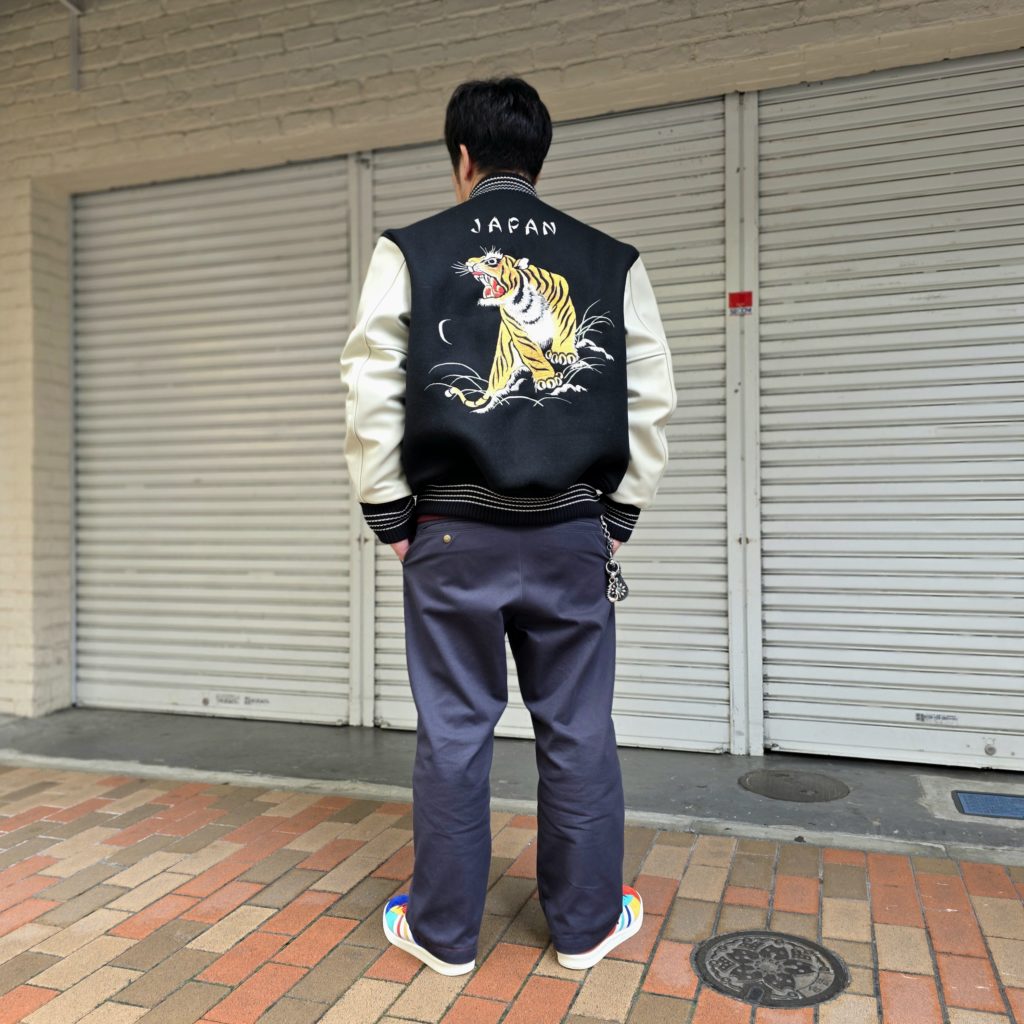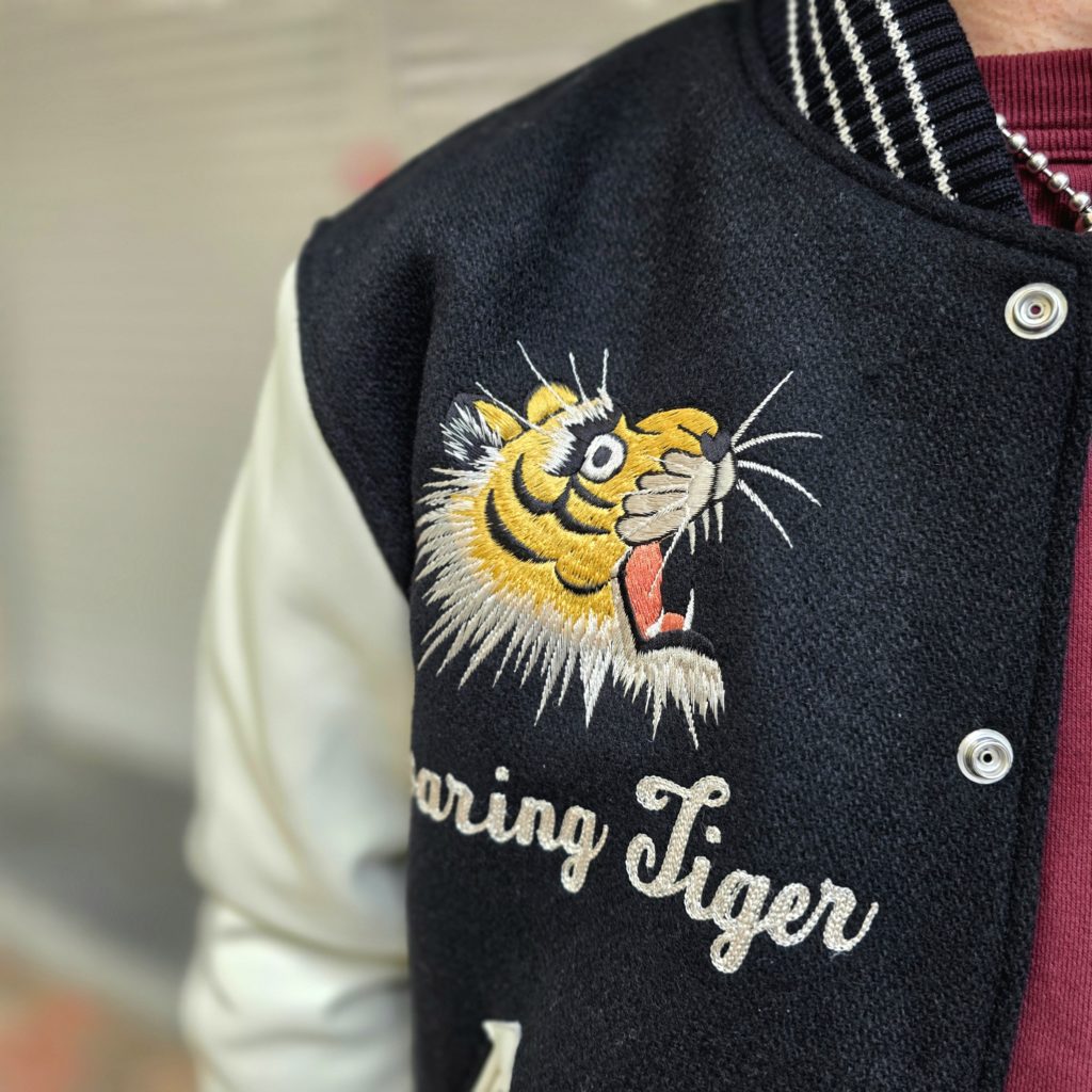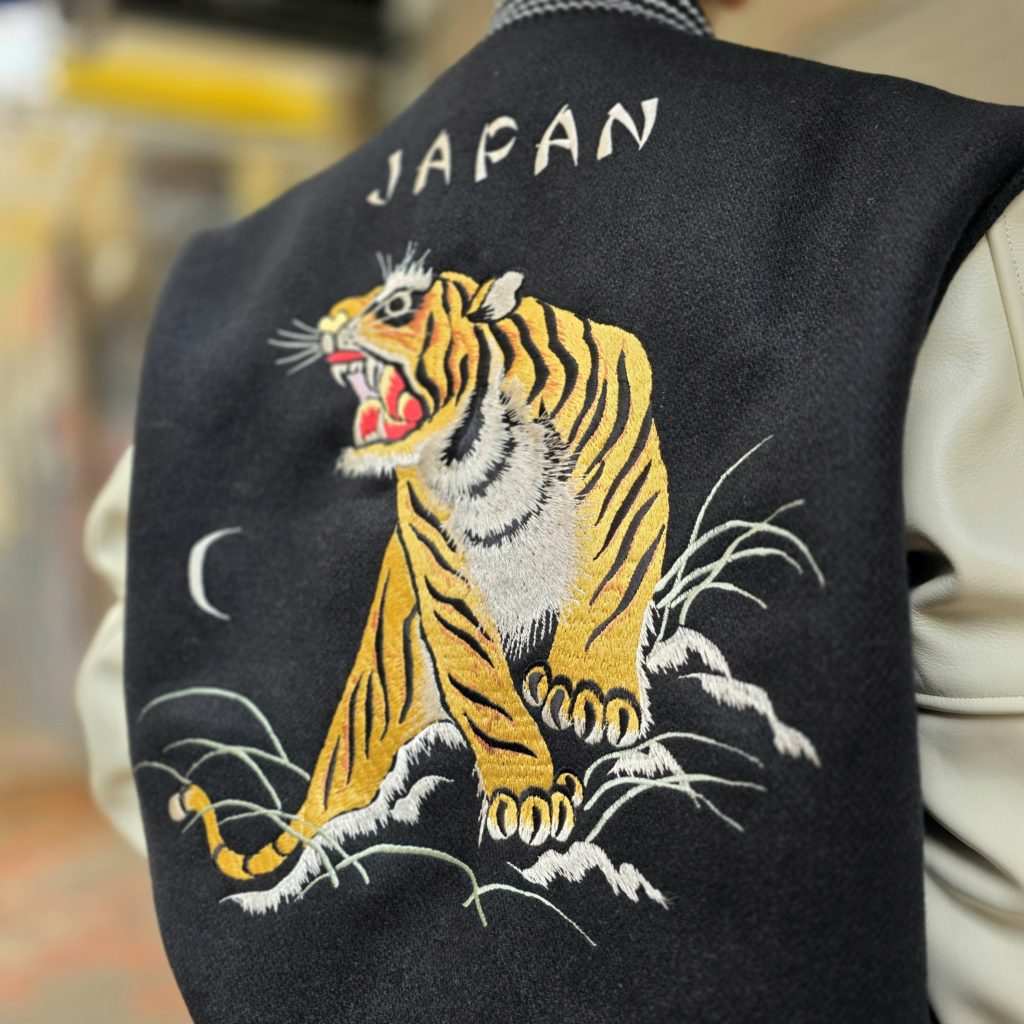 米兵に馴染み深いスタジャンを模して、日本で誕生したスカジャン。その当時とは逆の発想で、スカジャンを象徴するオリエンタルな刺繍をスタジャンに取り入れた唯一無二のモデル。スタジャンにみられるチェーン刺繍のみならず、日本古来の横振り刺繍で咆哮する虎の絵柄が描かれる。美しい縞模様が特徴であるこの虎柄は、1950年代中期に卓越した職人によって描かれた作品。繊細な刺繍と技術が光るスカジャンの土台には、通常アセテートや別珍素材が使用されるが、暖かみがあり落ち着いた表情のウールメルトンに刺繍を施すことにより、一風変わった雰囲気が楽しめる。