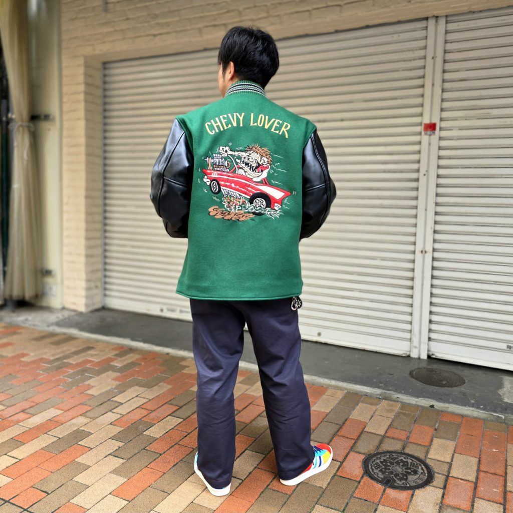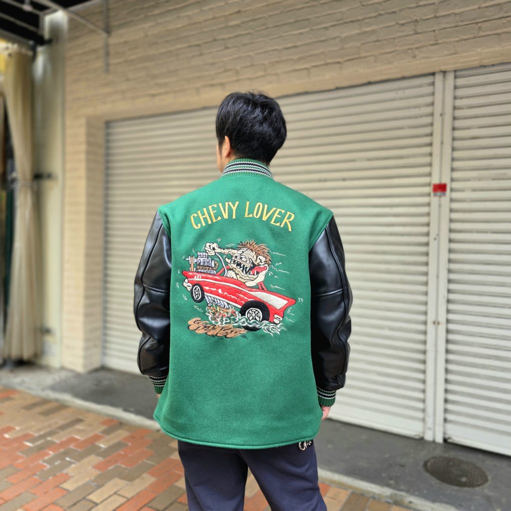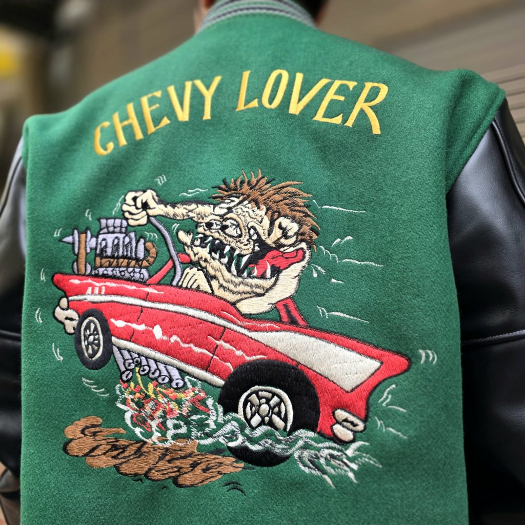 このデザインは1960年代のベトナム戦争時に作られたヴィンテージのスカジャンのデザインです。 クルマ好きの米兵がカスタムオーダーしたといわれ、モチーフは1957年式のシボレー・ベルエアで、アメリカのカスタムカルチャーが表れています。 アワードジャケットはカレッジがメインですが、カークラブジャケットとしての側面も持ち、このデザインはアワードジャケットのモチーフとして、非常によく合うデザインと言えます。