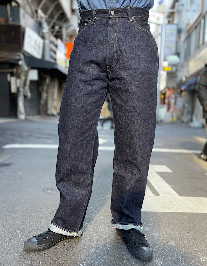 しかし股リベットや後中心の巻き縫いの方向(右高)は戦前モデルの仕様を踏襲。生地は前項のデニムブラウス同様に未熟な紡績のムラ糸を再現しており、荒々しい色落ちやエイジングに期待できる。このモデルには新たに製作したグリーンのフラッシャーが付けられる。