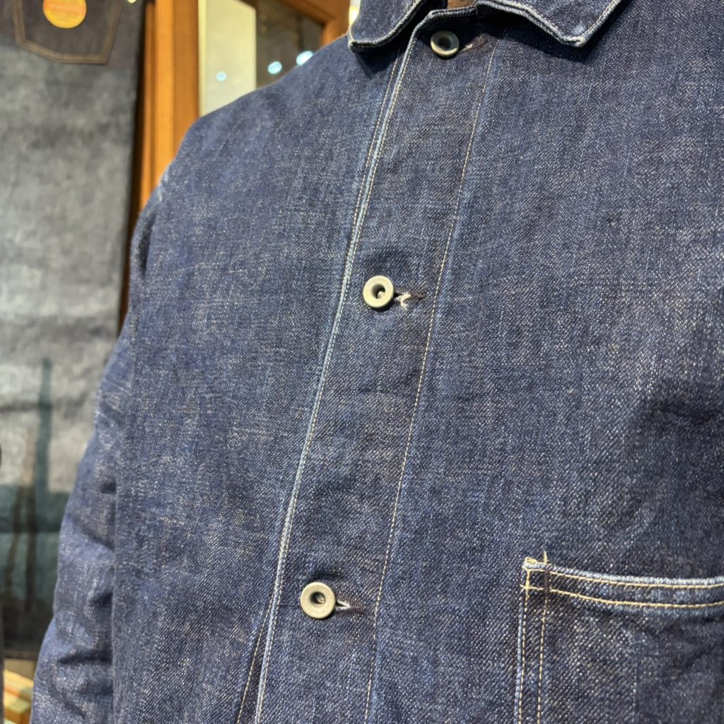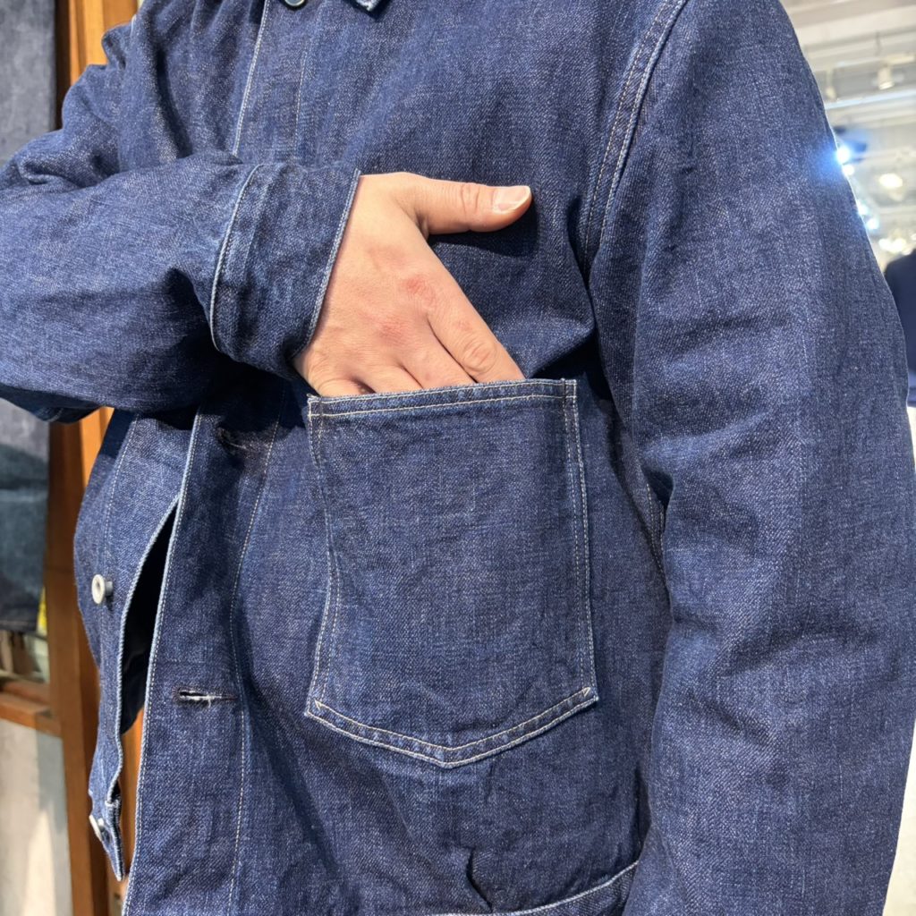1900年代初頭の炭鉱夫が着ていたであろうジャケットをイメージソースにデザインした、ショートジャケットです。素材は13.5ozのセルビッチデニム。経糸にジンバブエの長綿、緯糸には品種改良される前の天然の茶綿を使用し、シャトル織機で丁寧に織り上げたオリジナルデニムです。フロントは左ワンポケットのシンプルなデザインで、通常より小ぶりなタック釦を使用しています。前身頃と後ろ身頃の両方にタックを入れて全体的に丸みのあるシルエットを意識しました。脇にスリットを入れ腰帯にスライドバックルを配し、ウエストのシルエットに変化を付けれるデザインにアレンジ。
