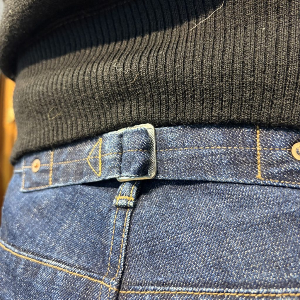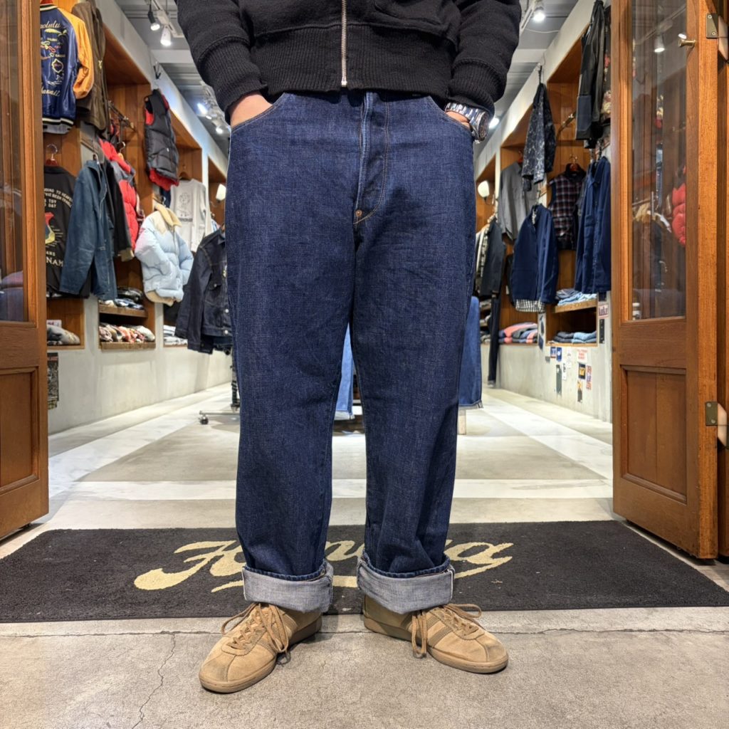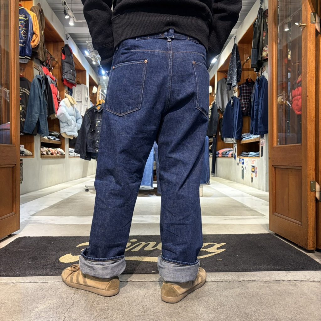 1800年後半~1900年代初頭の炭鉱夫が履いていたであろう、ジーンズからのインスピレーションでデザインされた5ポケットパンツの、リミテッドエディションです。第二次大戦中のL社のデニムを参考に、糸の撚りから研究しシャットル機で織り上げた13.5ozセルビッチぶデニムを使用。このモデル用に大戦モデルに使用されていた、百合の紋章が刻印された鉄製2本針バックルを使用。ポケットのスレキもブラックカラーのヘリンボーンを使用しています。股上をやや深めに設定し、ワタリから裾にかけて適度なゆとりを持たせたワイドストレートなシルエットです。一般的なジーンズの特徴である後ろのヨーク切り替えは行わずに、タテとヨコ2箇所にダーツを入れることで、ゆとりのある立体的なヒップ周りが表現されています。鉄製のオリジナルタックボタン、打ち抜きリベット、2本針のバックル、細巾のステッチワークなど当時のイメージを踏襲しつつ、オリジナリティーあるデザインに仕上がっています。