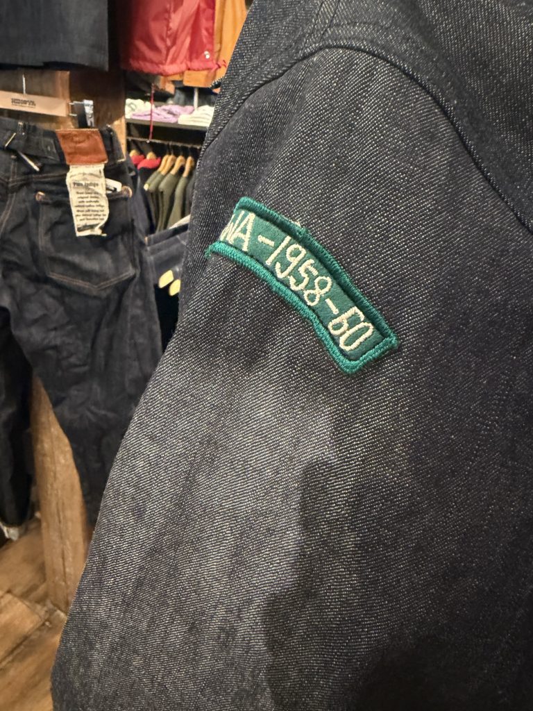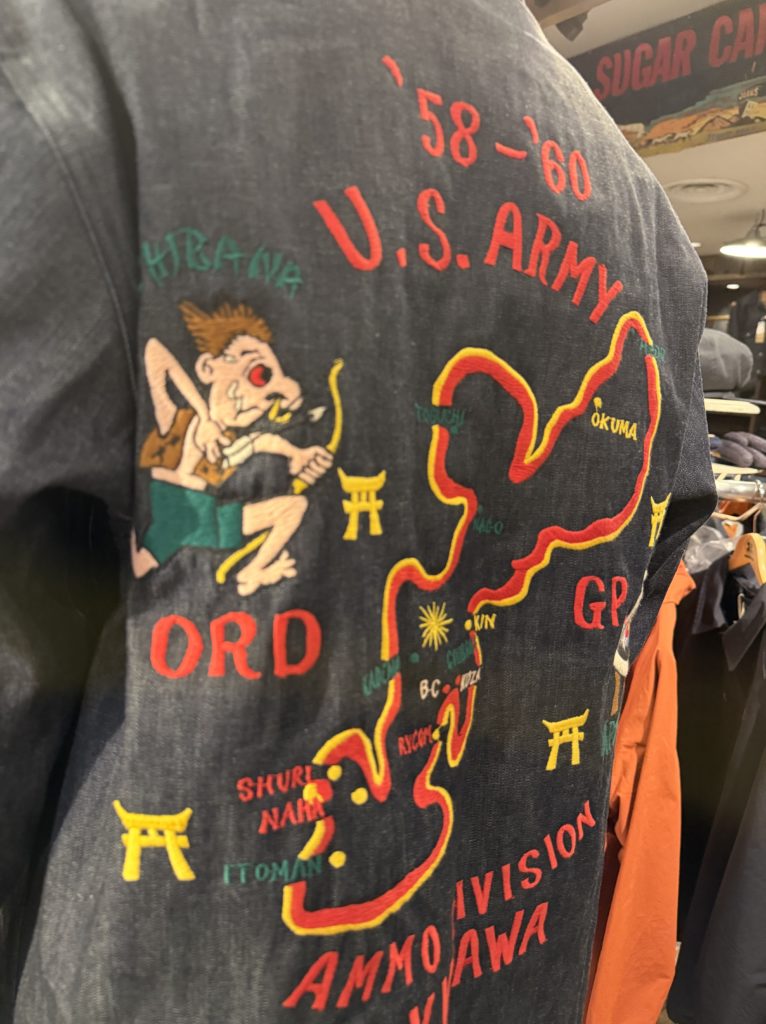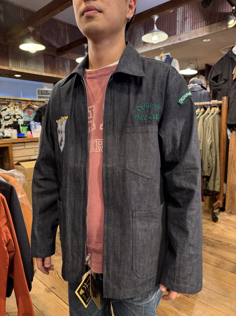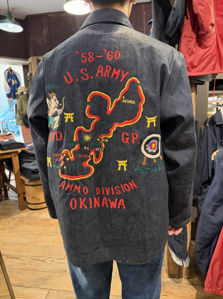 1950年代後期(1958〜60年)に沖縄へ駐留していたアメリカ陸軍弾薬部隊の兵士がカスタムオーダーで仕立てたスーベニアジャケット。通称「オキナワジャンパー」。同部隊は「チバナ・アーチャーズ」と名付けたアーチェリークラブを結成し、基地内で大会を開催していた。刺繍のモチーフは部隊のスコードロンやクラブのキャラクター、そして沖縄のマップ。ボディは8.5オンスのブルーデニムで、ヴィンテージをもとに褪色していないデッドストックの状態を想定している。