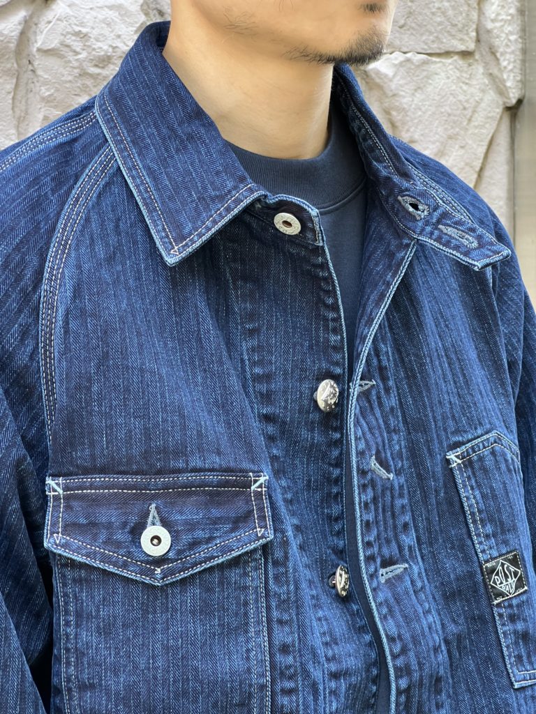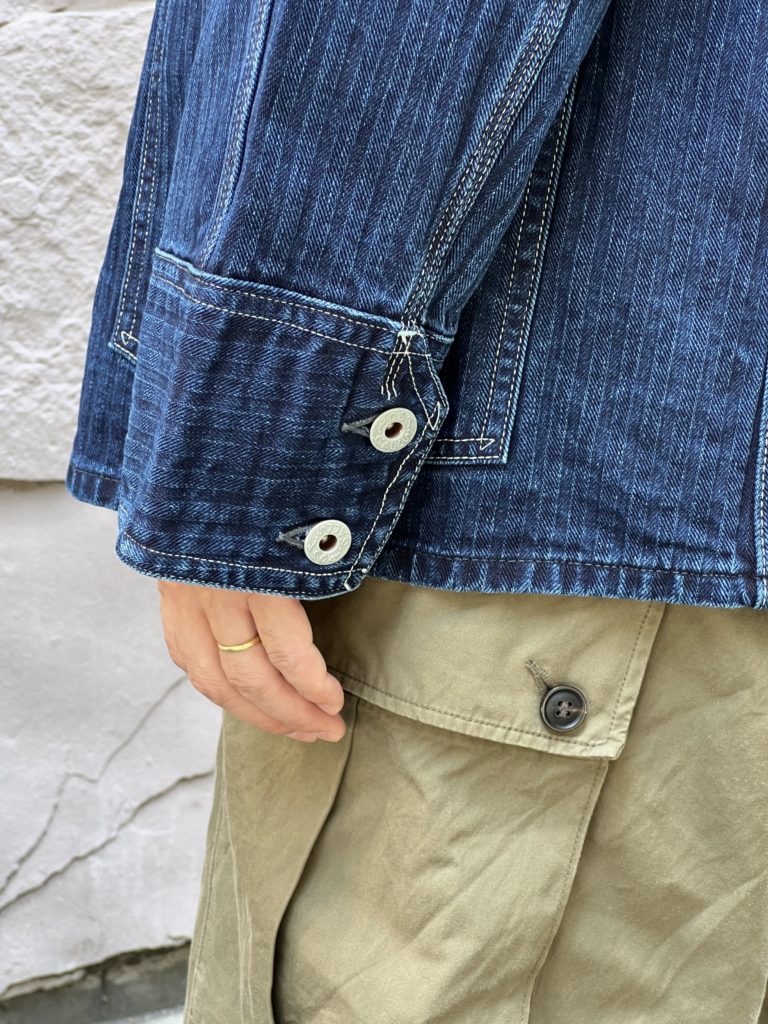 ディープなトーンのヘリンボーン・デニムを使用。