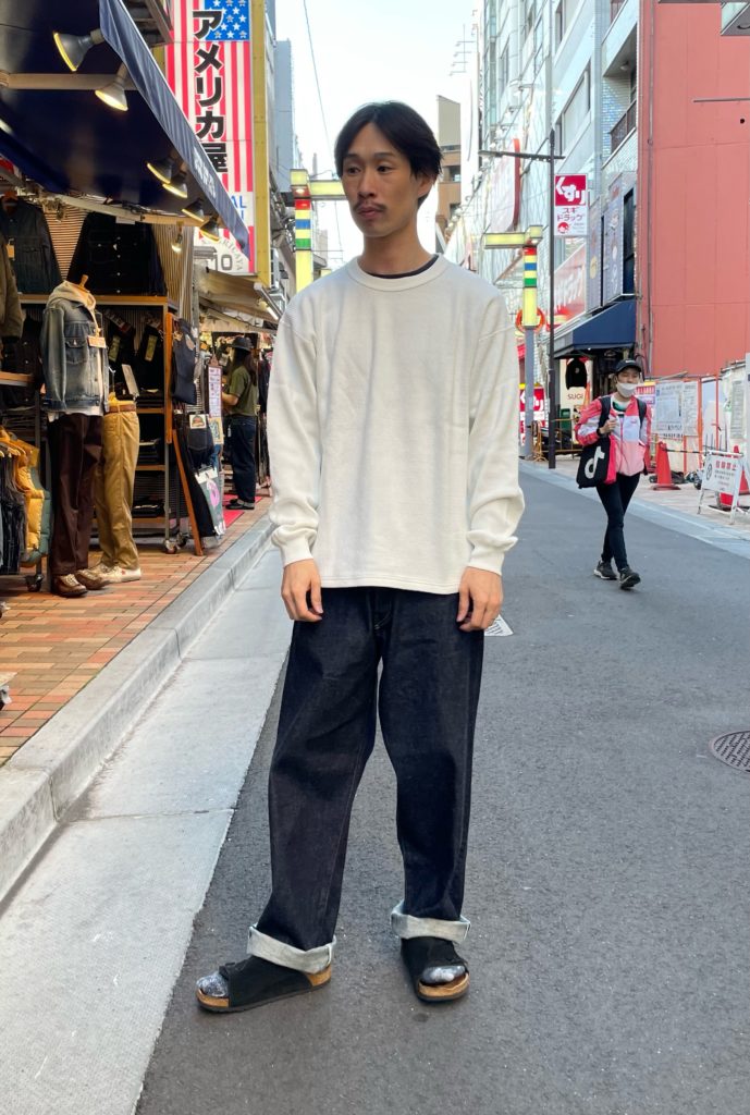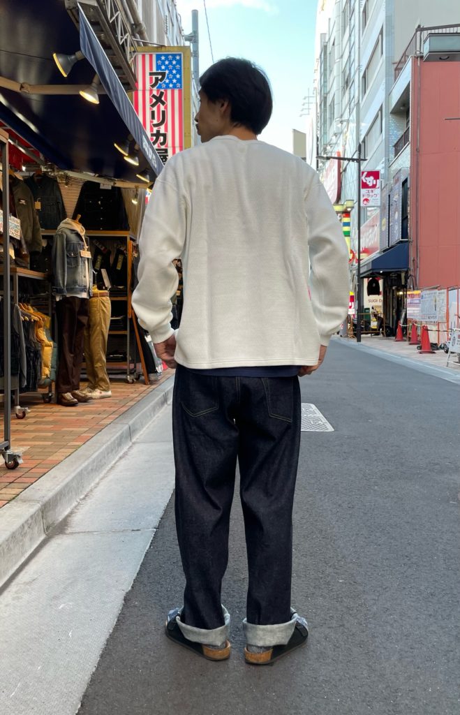 本日ご紹介するのは、GOLDより9/7日(土曜日)発売の「RECYCLED WASTE SUVIN COTTON YARN11.5oz DENIM 5POCKET WIDE PANTS」と「HEAVY THERMAL T-SHIRT」を。