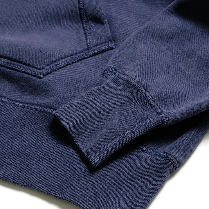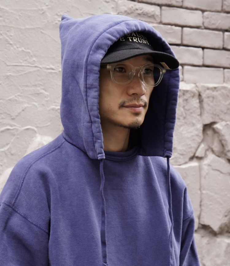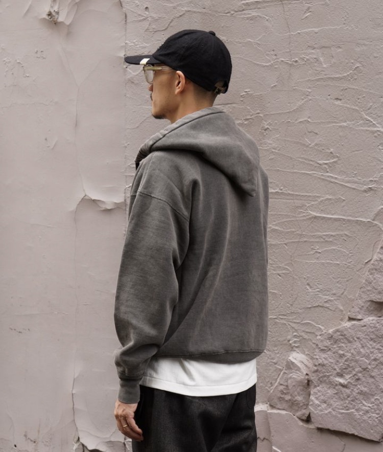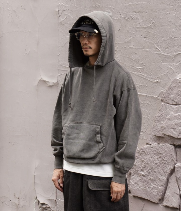 後付け仕様のフードが特徴の、製品染めフーディ。
