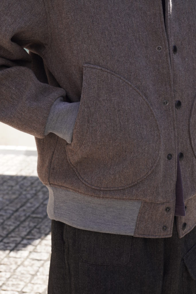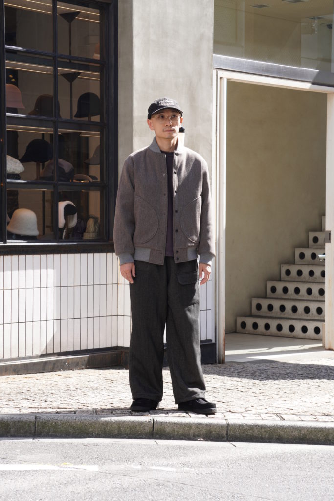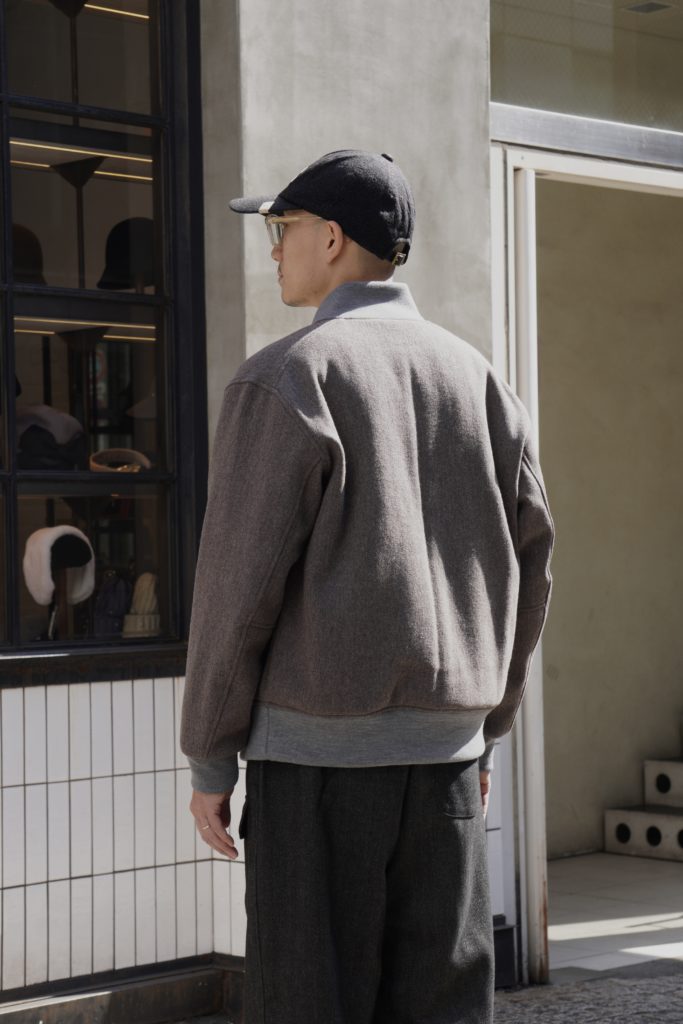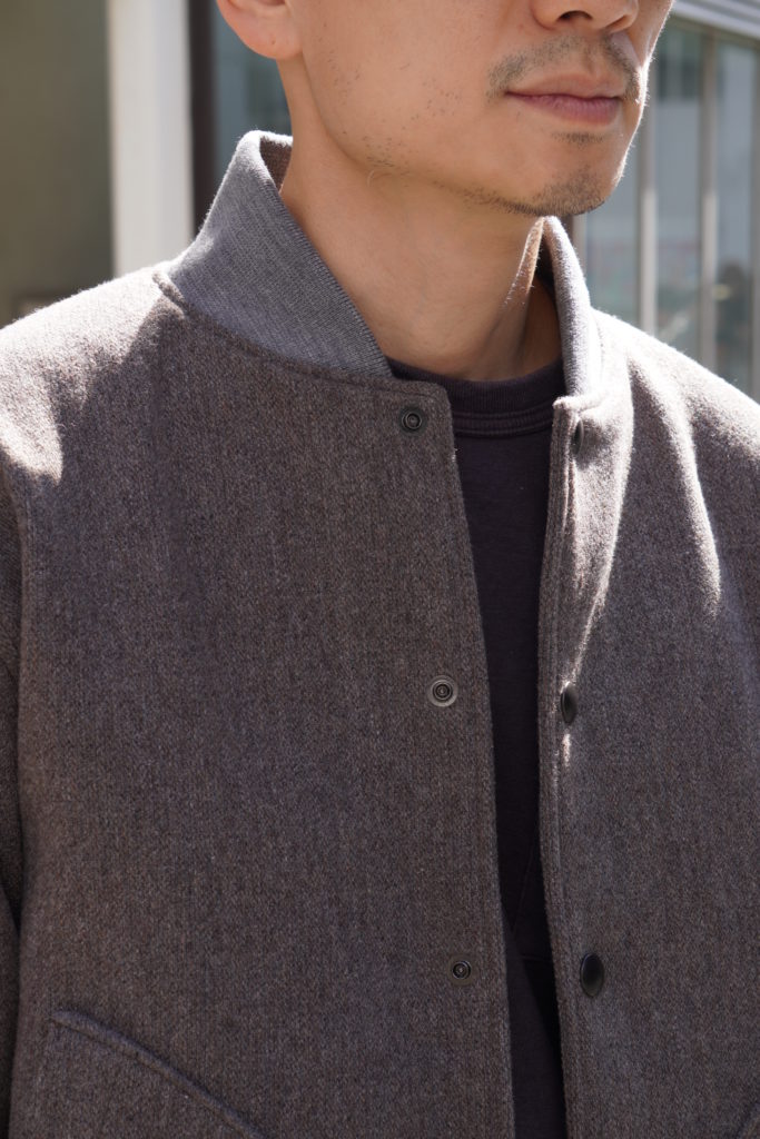 このアワードジャケットは1900年代初頭の雰囲気を出すため縮絨を行わず洗い加工のみを施し柔らかさや光沢感を抑えた風合いにしています。